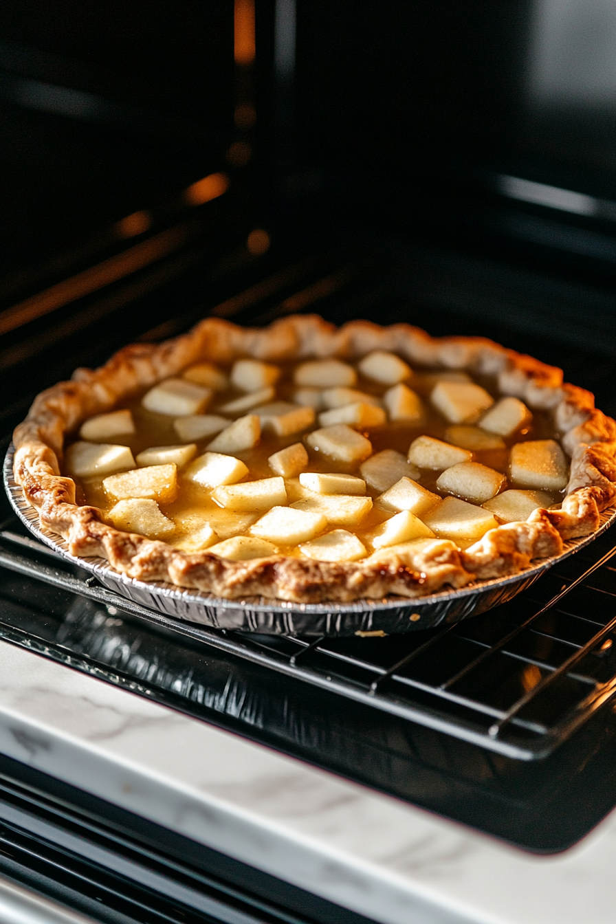 Pour the apple mixture into the pie crust, pressing down and mounding slightly in the center.