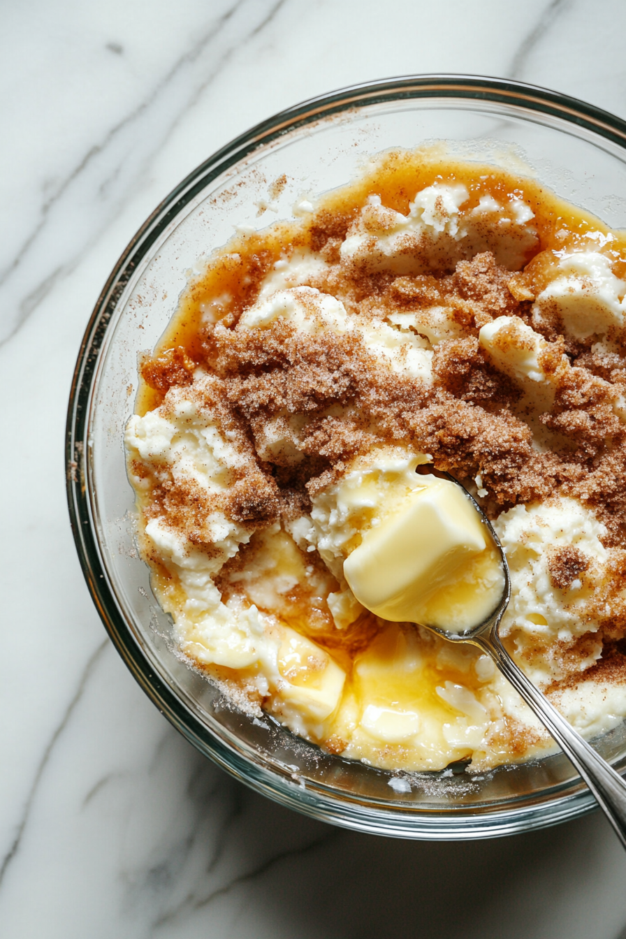 In a bowl, mix flour, sugar, cinnamon, and salt for the crumble. Add melted butter and stir until large clumps form. Chill if necessary to form crumbles.