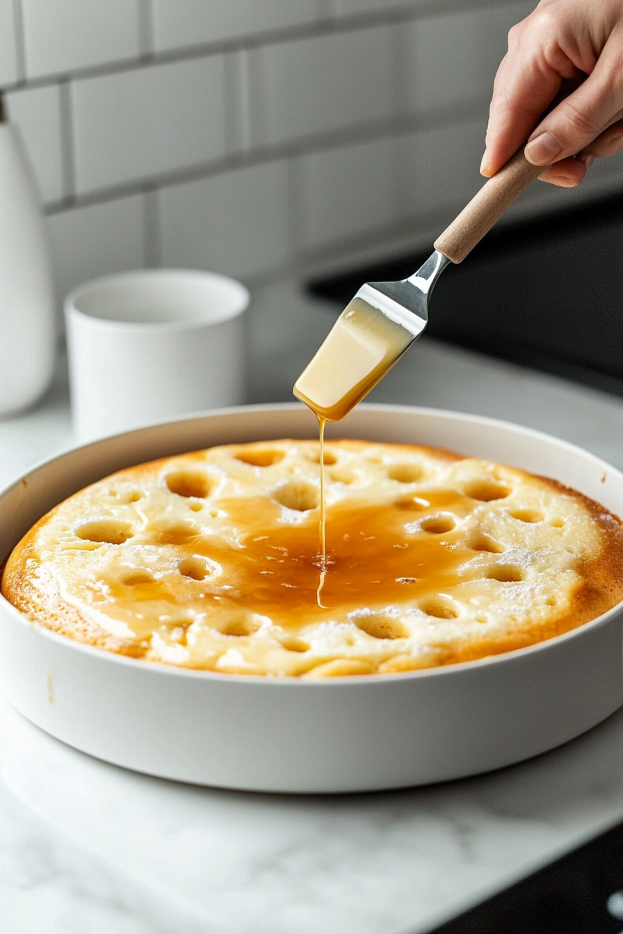 Add Glaze: Mix powdered sugar, milk, and vanilla for the glaze. Poke holes in the hot cake, pour glaze over, and let set for 20 minutes before serving.