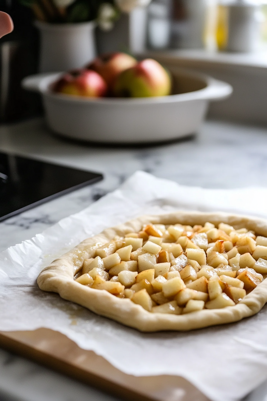 Arrange apple filling on the dough, leaving a border, and fold edges over.