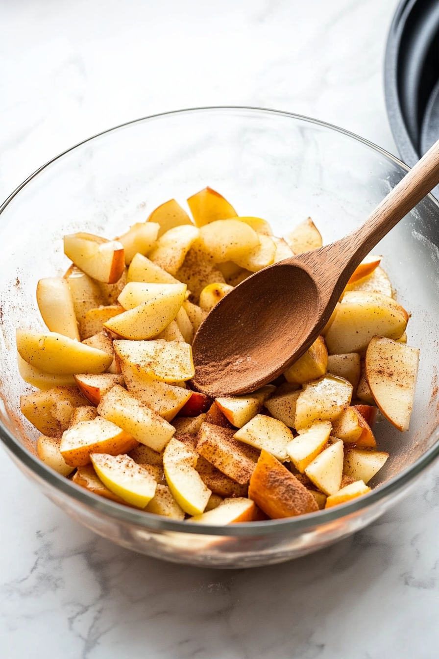 In a large bowl, toss sliced apples with sugars, flour, cinnamon, nutmeg, lemon juice, and zest until evenly coated.