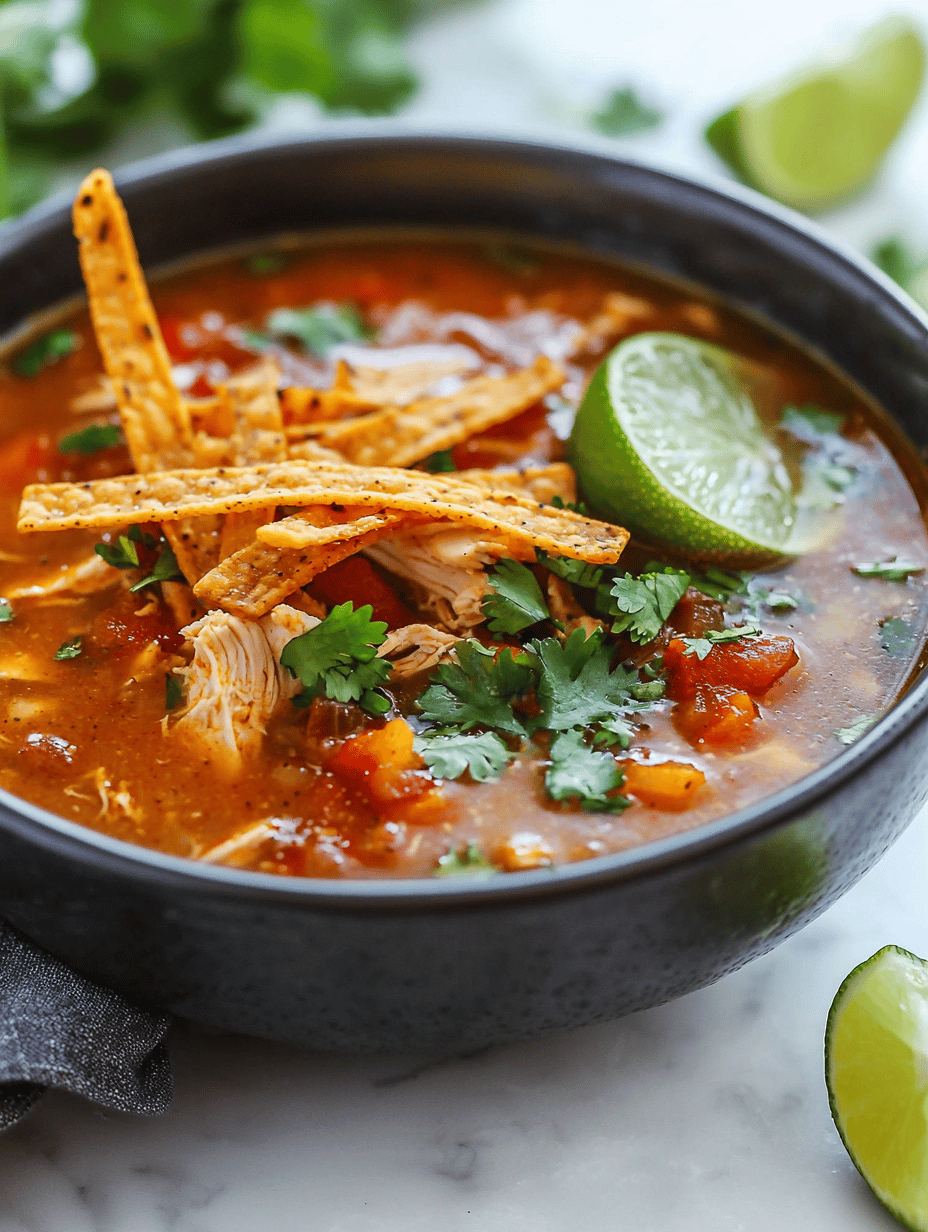 Squeeze fresh lime juice into the soup for brightness and stir well. Ladle the hot soup into bowls, top with crushed tortilla chips for crunch, a dollop of sour cream if desired, and an extra squeeze of lime for added zest.
