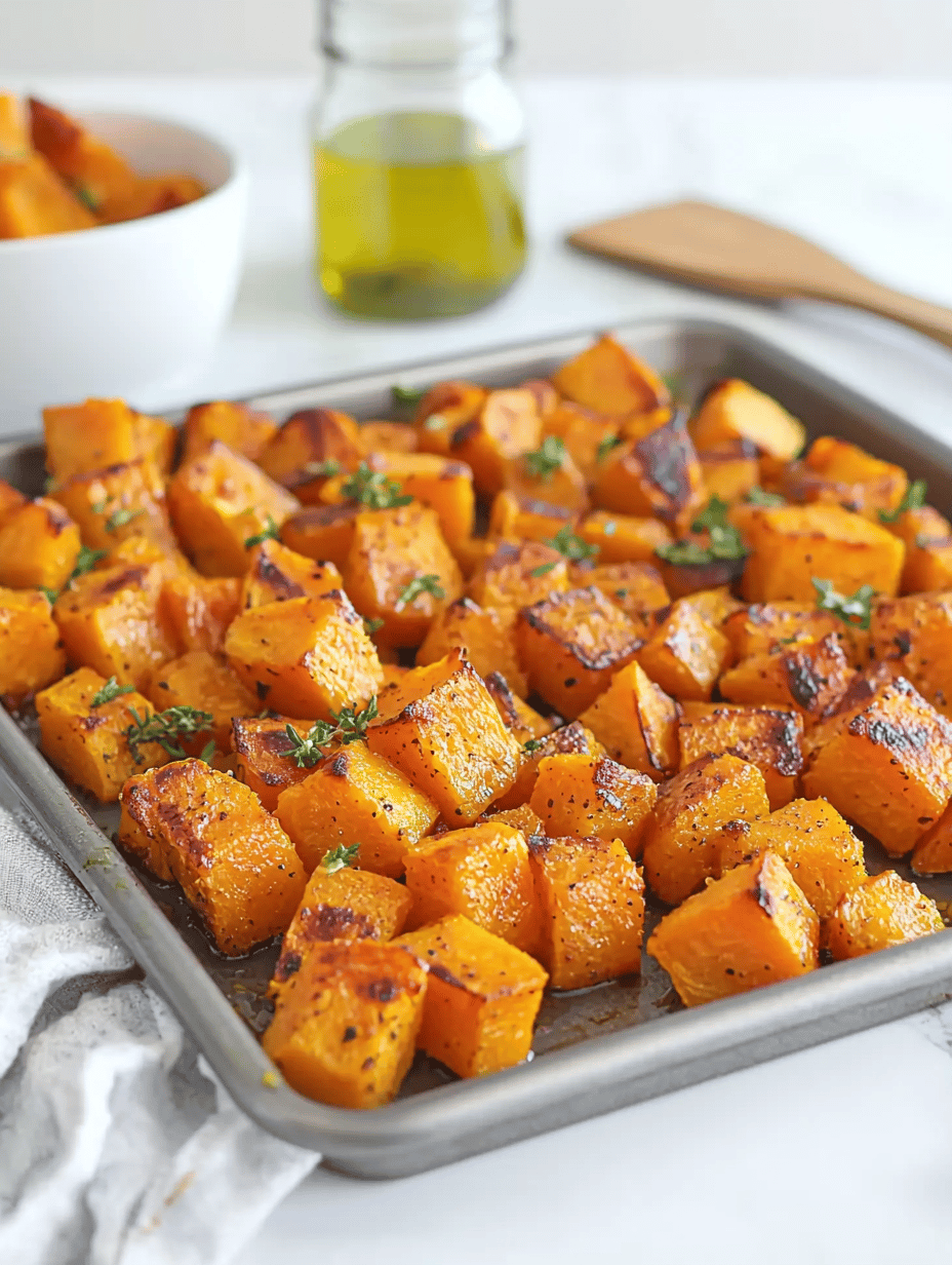 Preheat your oven to 400°F (200°C). Spread the cubed butternut squash on a baking sheet, drizzle with a tablespoon of olive oil, and toss to coat. Roast for about 25-30 minutes until tender and caramelized, then set aside.