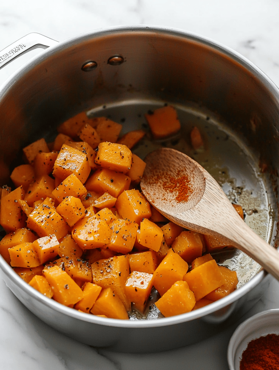 While the squash roasts, heat a large pot or Dutch oven over medium heat. Add the remaining tablespoon of olive oil, then sauté the diced onion until translucent and fragrant, about 5 minutes. Add the minced garlic and cook for another minute until aromatic.
