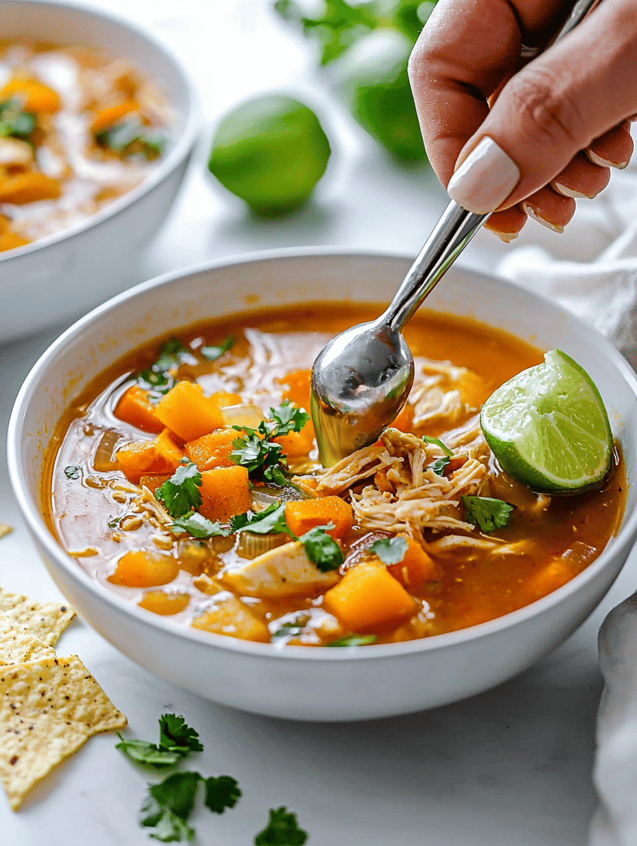 Enjoy your comforting bowl of autumn-inspired chicken tortilla soup, with its rich, smoky flavors balanced by sweet roasted squash and fresh lime.