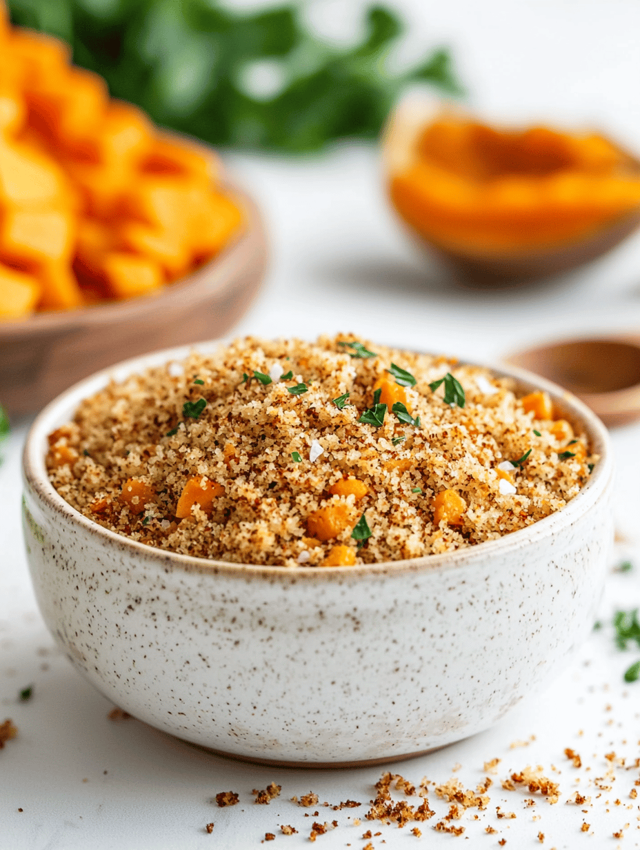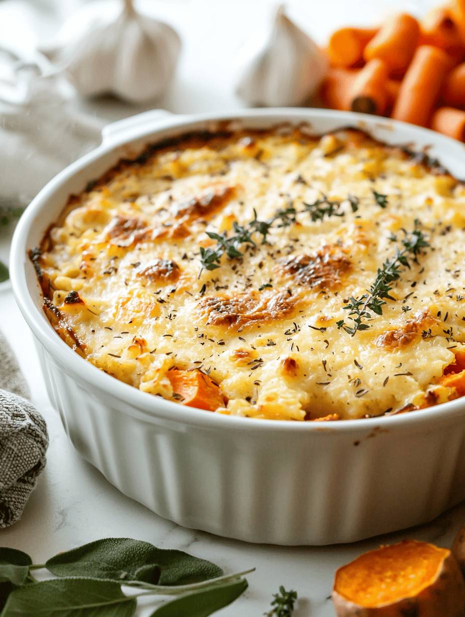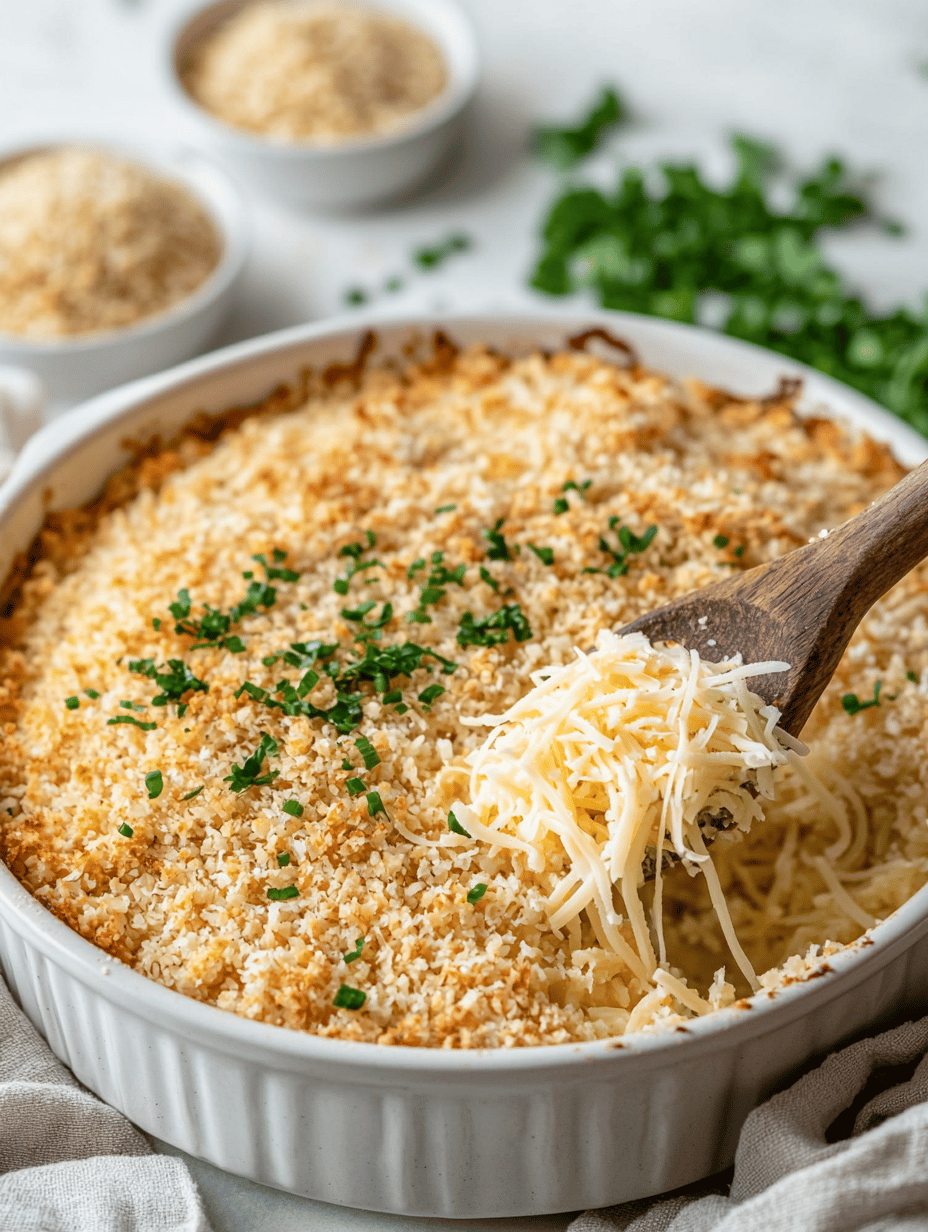This fall casserole combines layered vegetables, crispy breadcrumbs, and melted cheese, baked until golden and bubbly. The dish features a mix of roasted seasonal vegetables, topped with a crunchy breadcrumb crust, resulting in a hearty and textured final appearance. It balances sweet, savory, and crunchy elements for a cozy autumn-inspired meal.