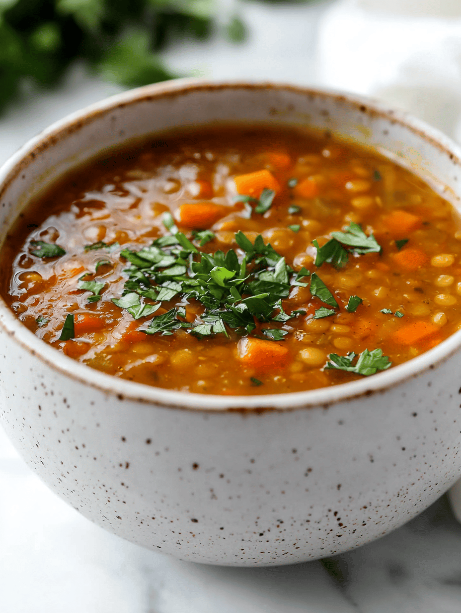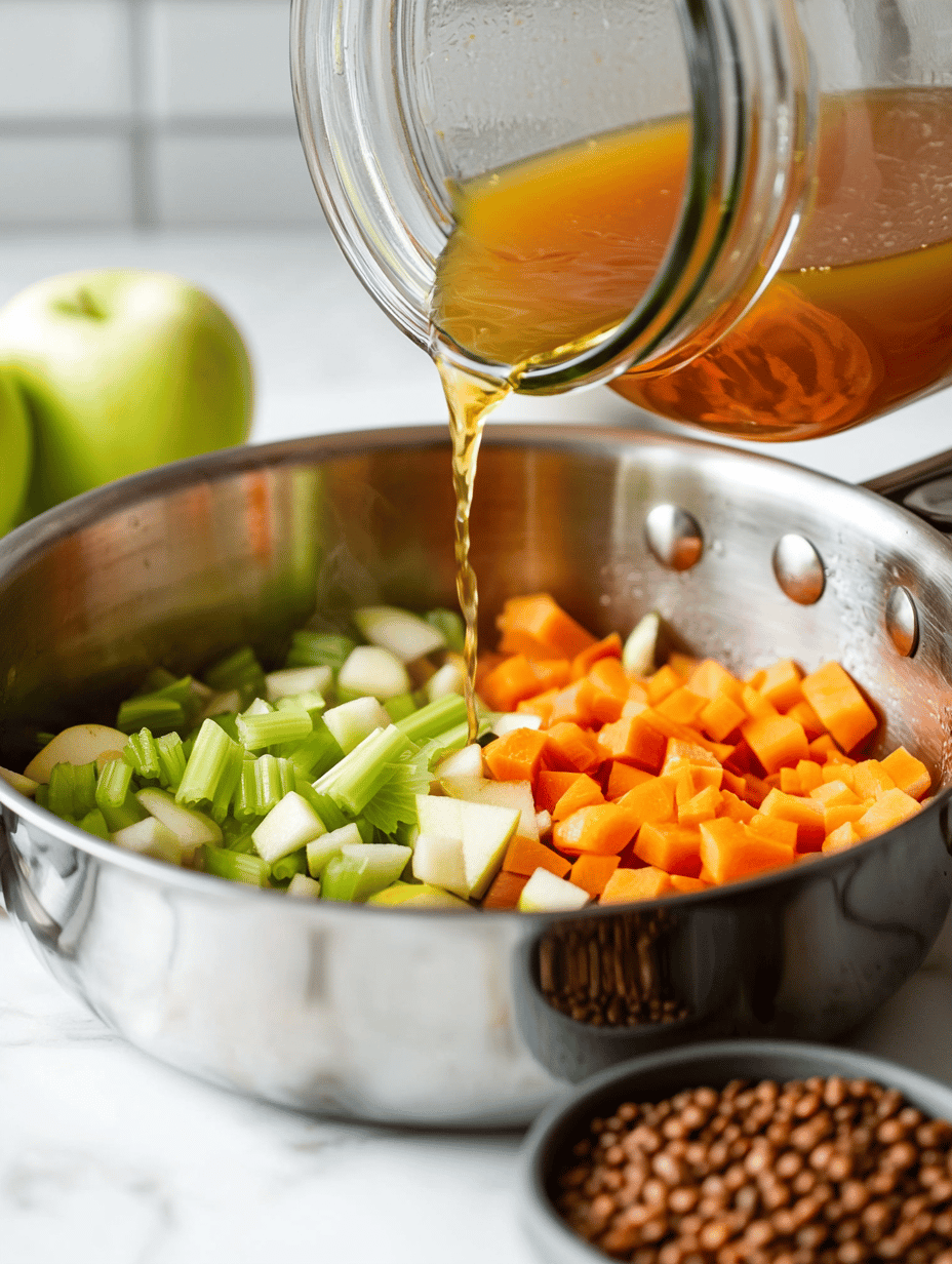 This hearty soup features earthy lentils simmered with smoky spices and infused with the natural sweetness of apple cider. The result is a thick, velvety broth filled with tender lentils and chunks of seasonal vegetables, showcasing warm autumn flavors and an appealing rustic appearance.