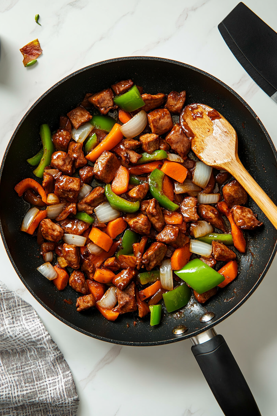 Heat oil in a sauté pan and cook diced onions, green peppers, and carrots until softened.