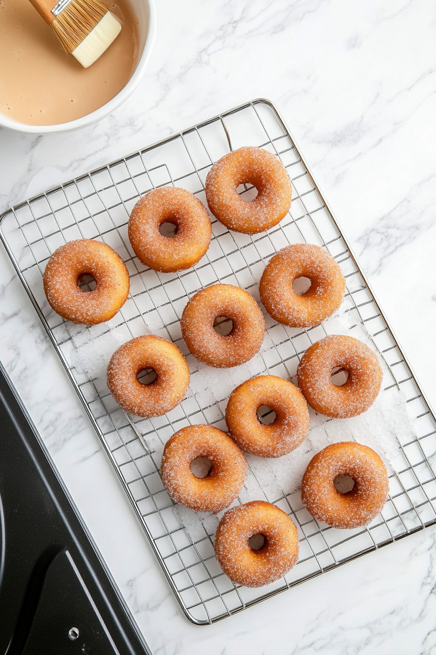 Bake for 10-11 minutes, until the donuts are lightly browned and bounce back when touched. Cool for 2 minutes, then transfer to a wire rack.