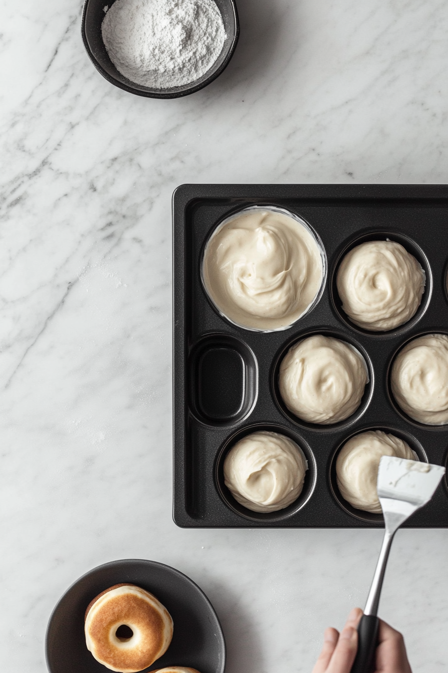 Spoon or pipe the batter into the donut pan, filling each cavity halfway.