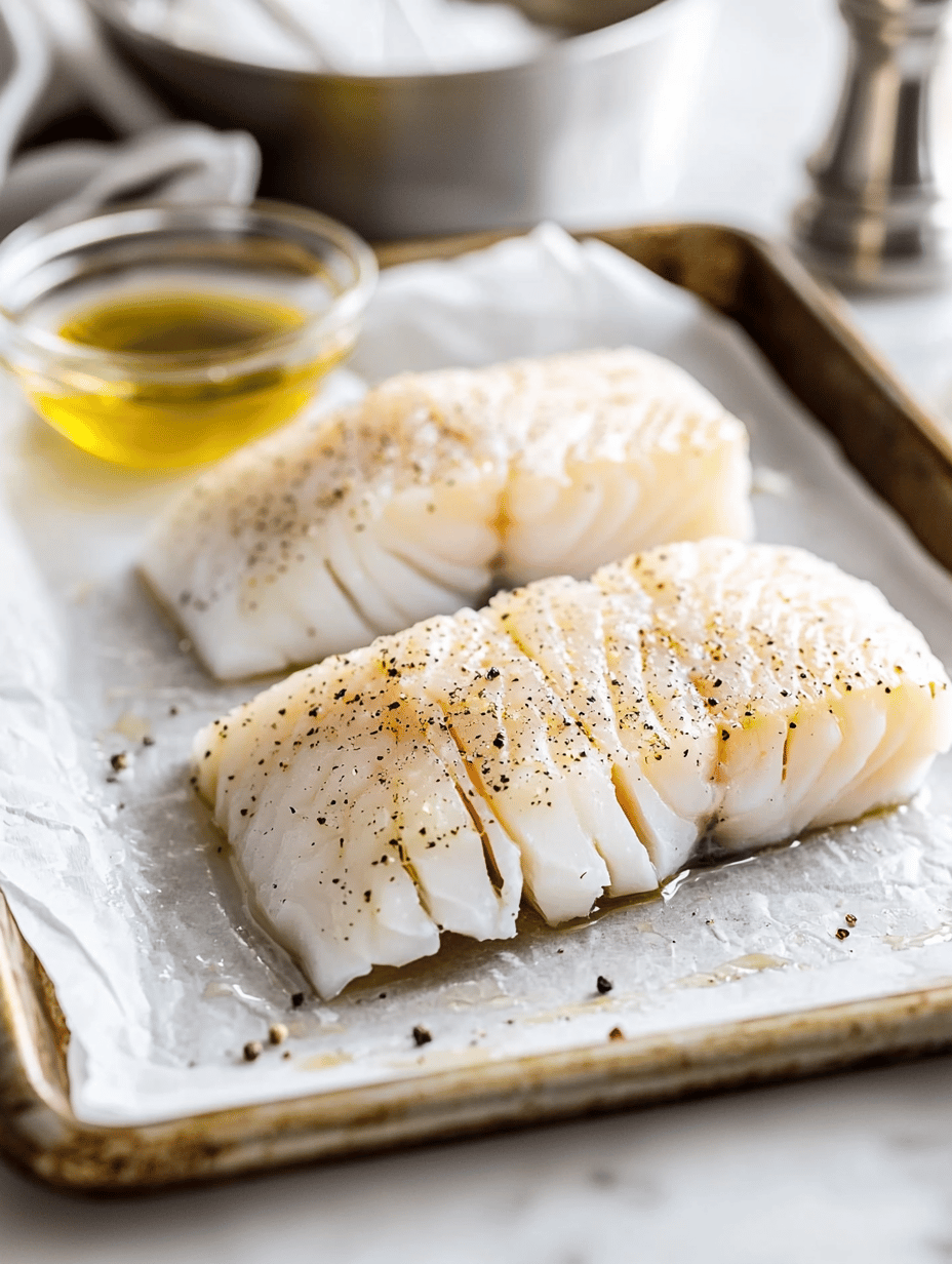 Place the cod fillets on the prepared baking sheet and pat them dry with paper towels. Drizzle one tablespoon of olive oil over the fillets, then season generously with salt and pepper.