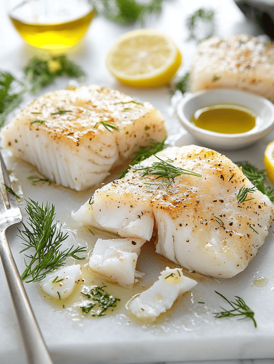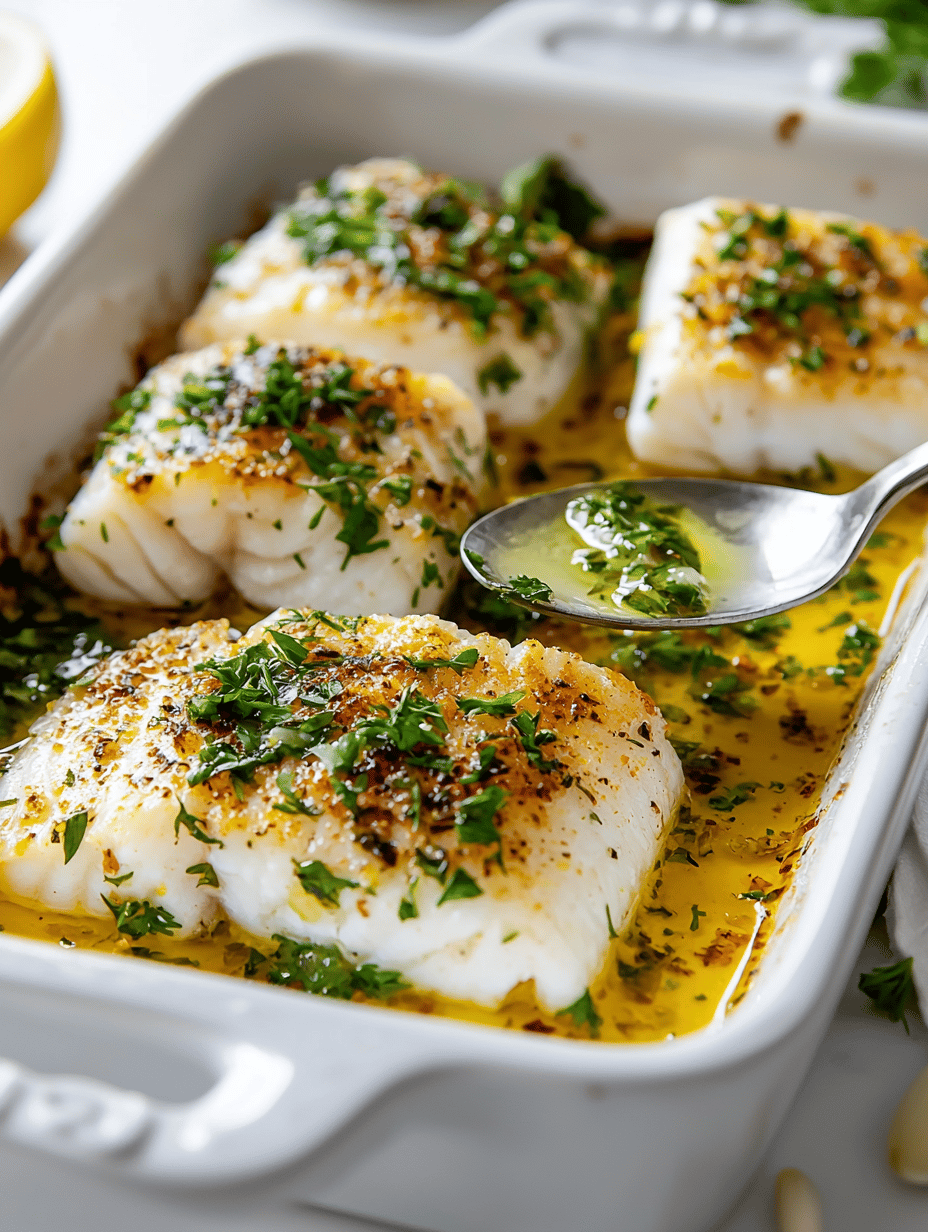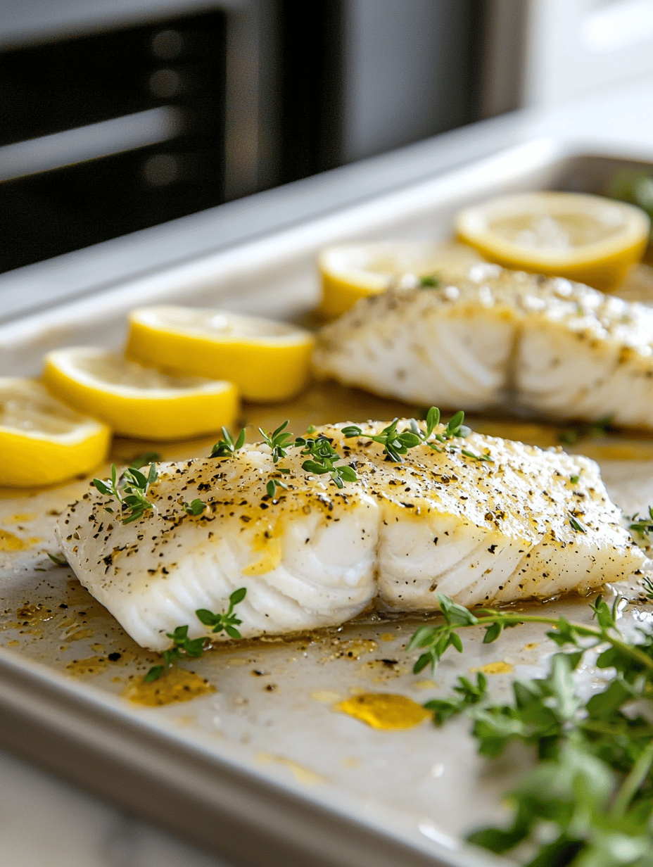 This baked cod recipe involves gently seasoning the fish with lemon zest and fresh herbs, then baking it until flaky and tender. The final dish has a delicate, moist texture with a light golden crust on top, showcasing the clean flavors of the fish and citrus.