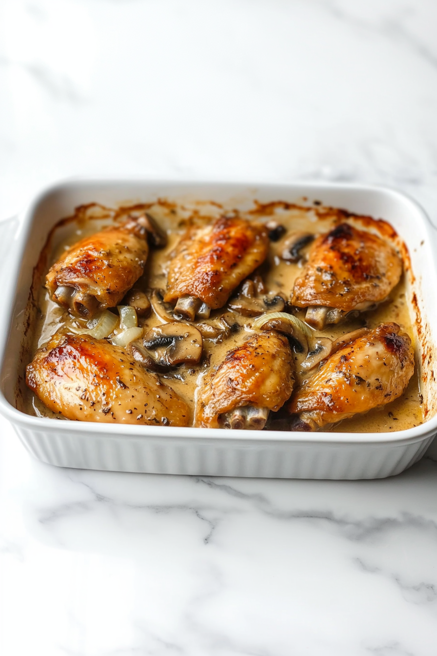 Mix cream of mushroom soup with ½ cup water and pour over the wings.