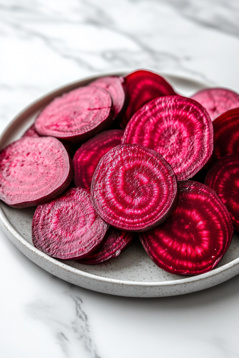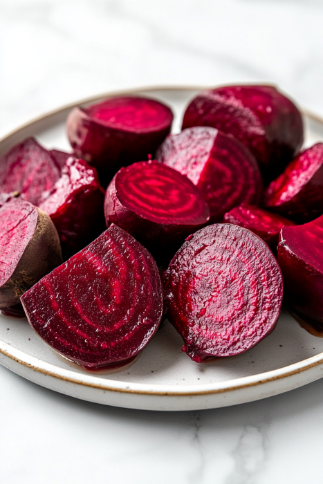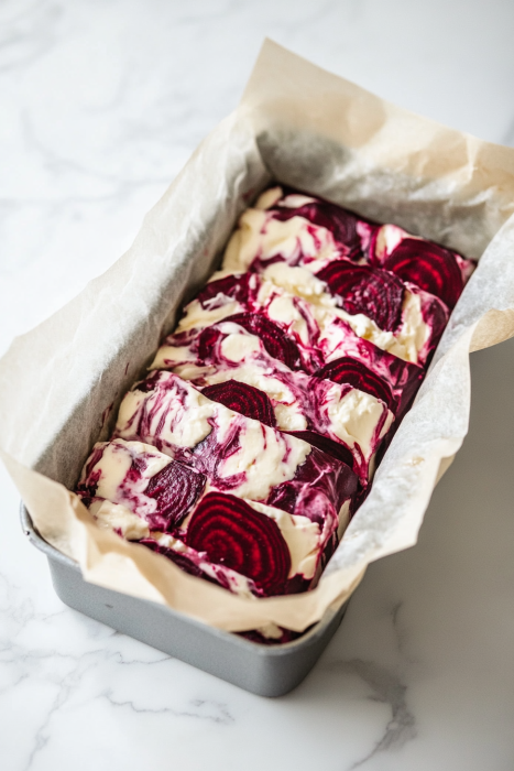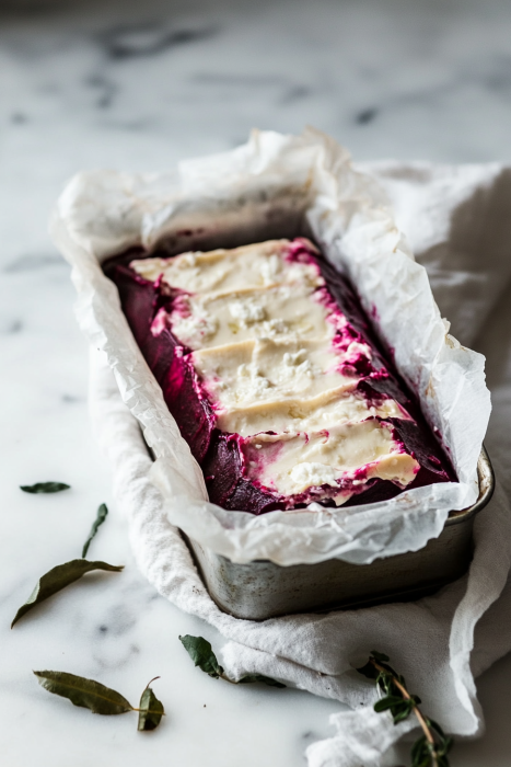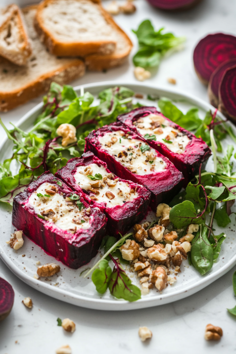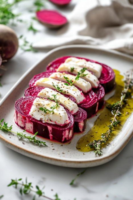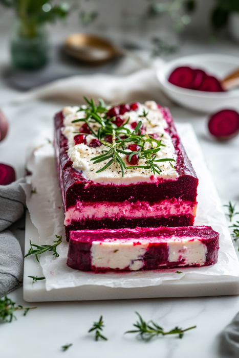 Cook the BeetsBoil or roast the beets until tender, then let them cool and peel them. Slice the Beets ThinUsing a sharp knife, slice them into even, thin rounds. Prepare the Cheese FillingMix goat’s cheese with yogurt, lemon juice, salt, and pepper until creamy. Line the MoldLine a loaf pan with parchment so the terrine lifts out easily. Start LayeringSpread a thin layer of cheese, then a layer of beet slices, repeating the pattern. Press and ChillPress the layers gently and refrigerate for at least 2 hours to set. Unmold and SliceOnce firm, Lift it out and cut neat slices with a sharp knife. Add Finishing TouchesA drizzle of olive oil or a sprinkle of herbs makes it look fresh on the plate. Serving StepI serve it cold with bread, greens, or a handful of nuts for texture.
