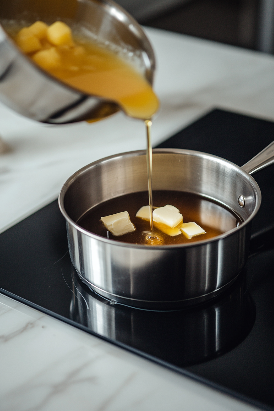Drain drippings from the roasting pan into a small saucepan and combine with the remaining 2 Tbsp butter, bring to a simmer, and remove from heat.
