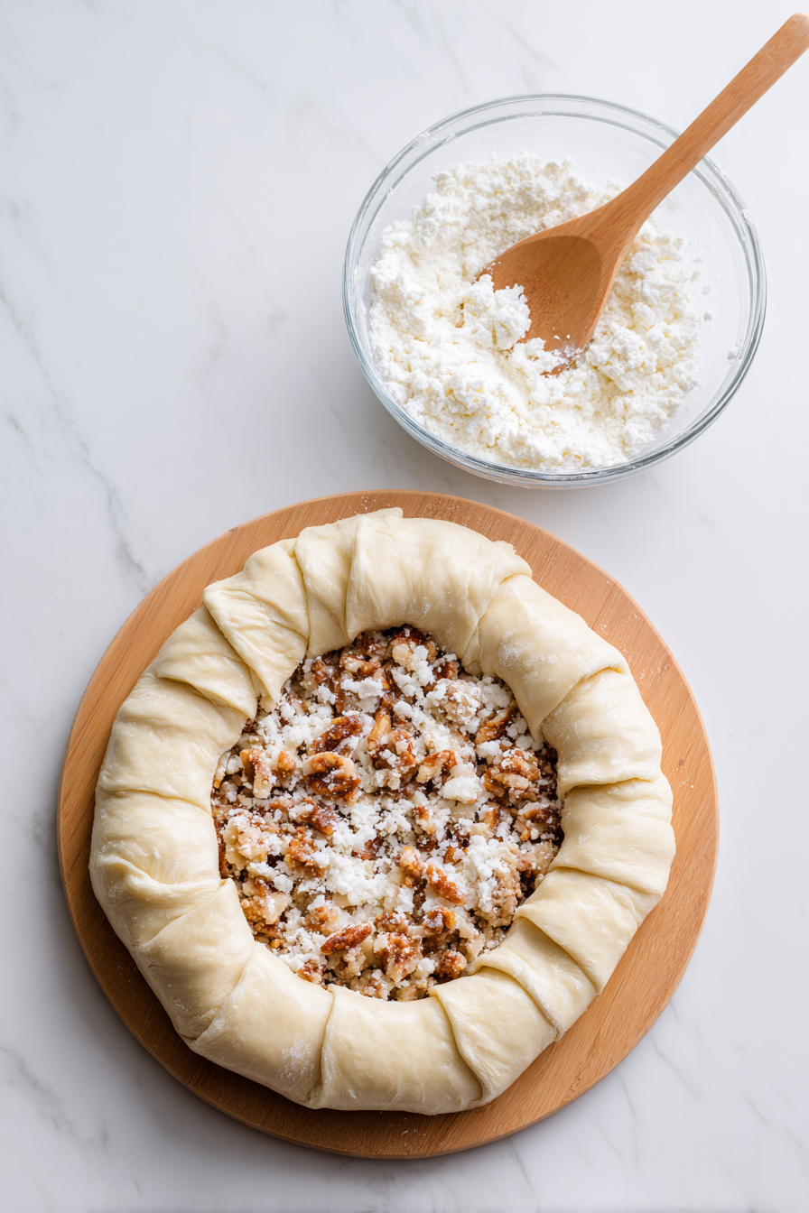 Fold the pointed ends of the crescents over the filling, tucking them under the wide ends to create a ring. Press to seal any openings.