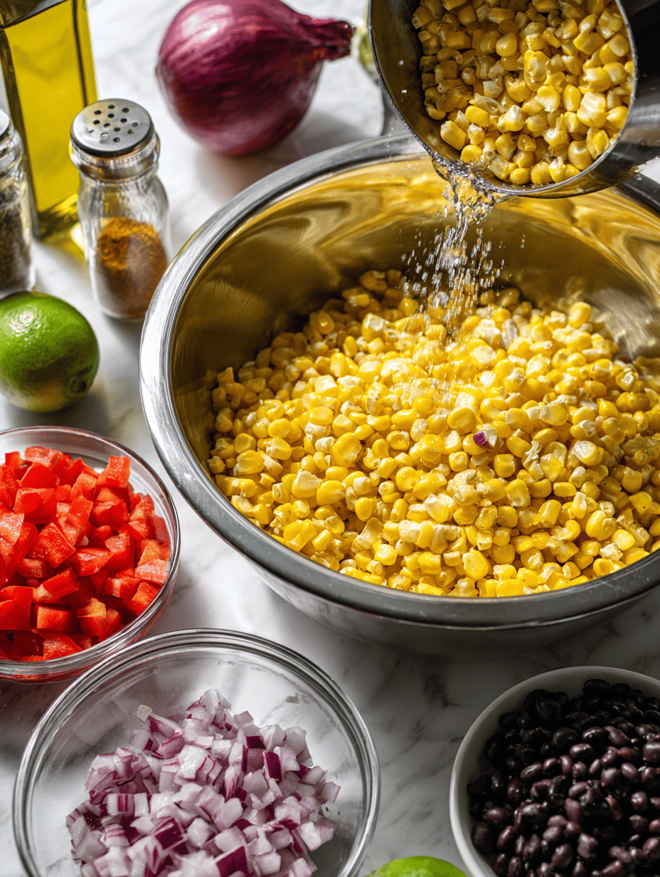 Measure out one cup of corn kernels—use fresh, frozen, or canned—and add them to a large mixing bowl.