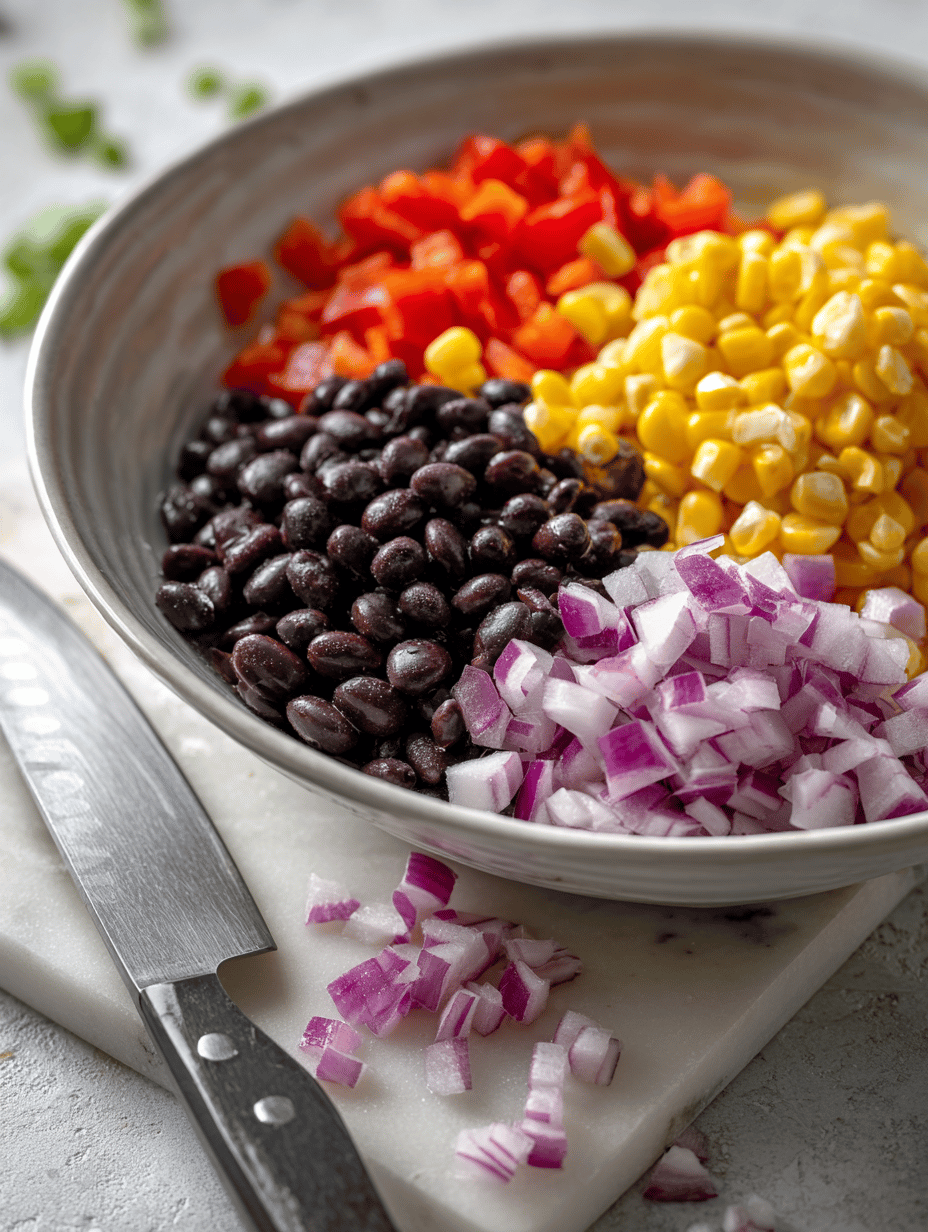 Dice the red bell pepper into small pieces, then add to the bowl along with the drained beans.