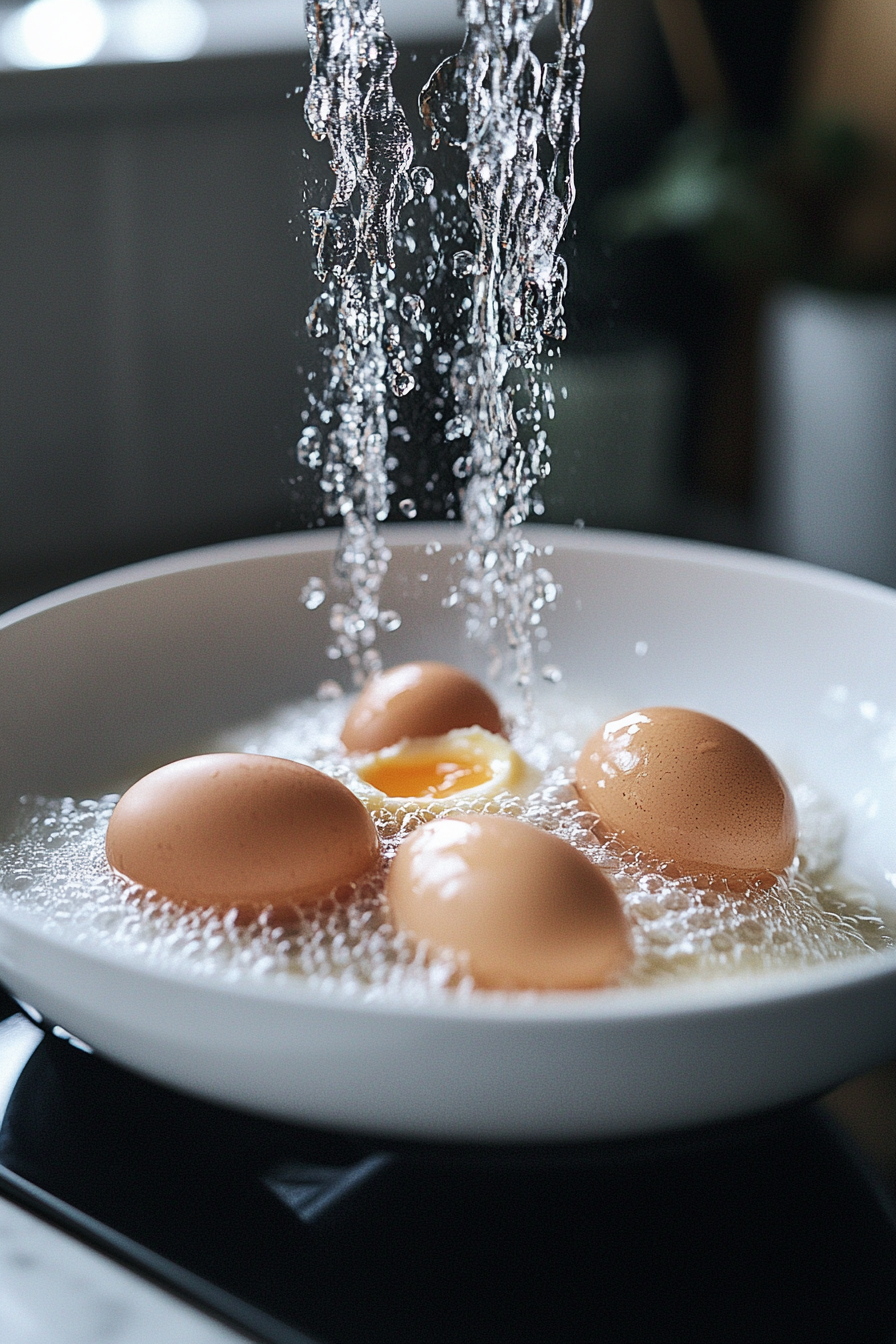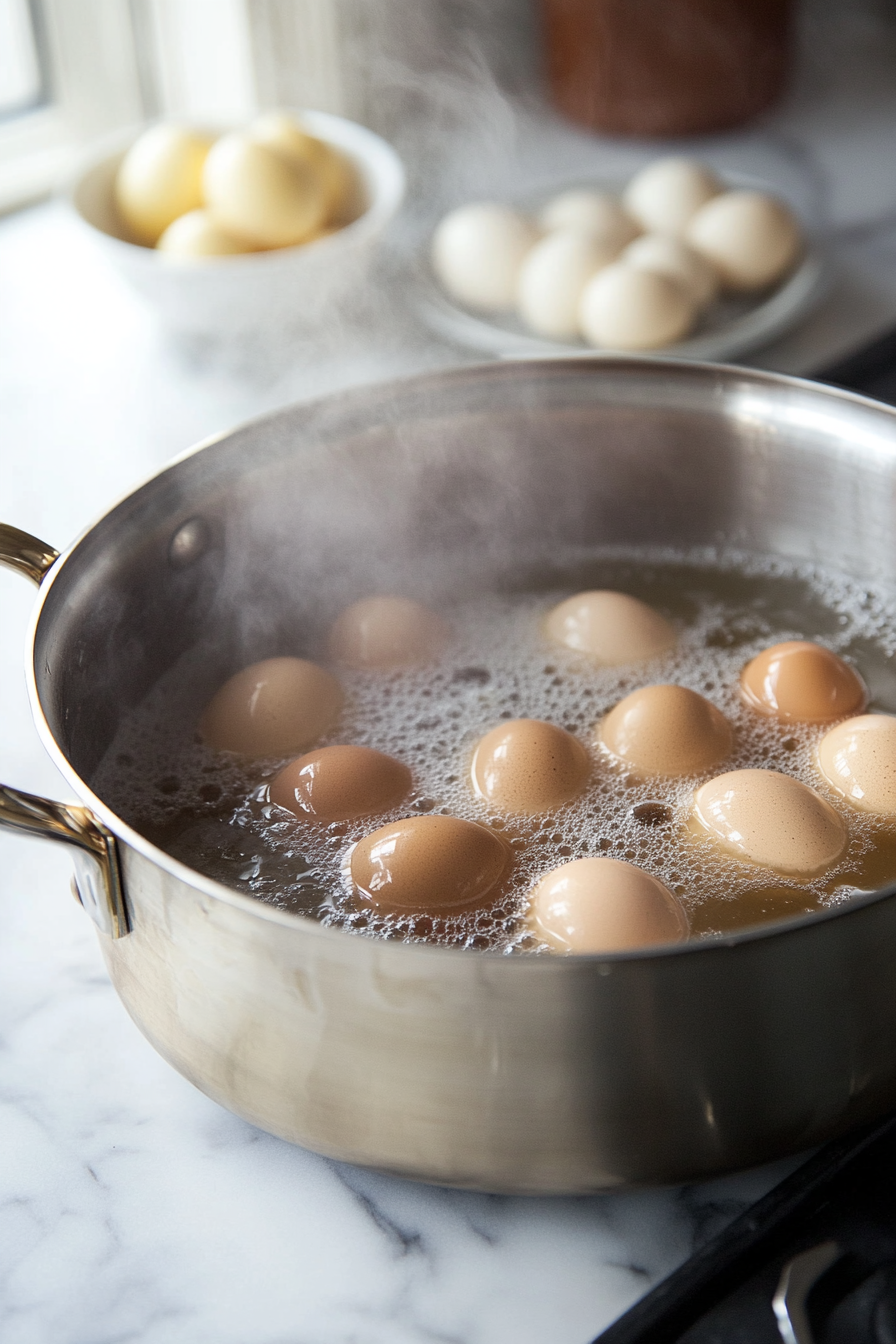 Boil: Bring a pot of water to a boil. Optionally, add salt and vinegar. Gently add cold eggs and lower heat to a simmer. Cook for 13 minutes, then transfer eggs to ice water for 15 minutes before peeling.