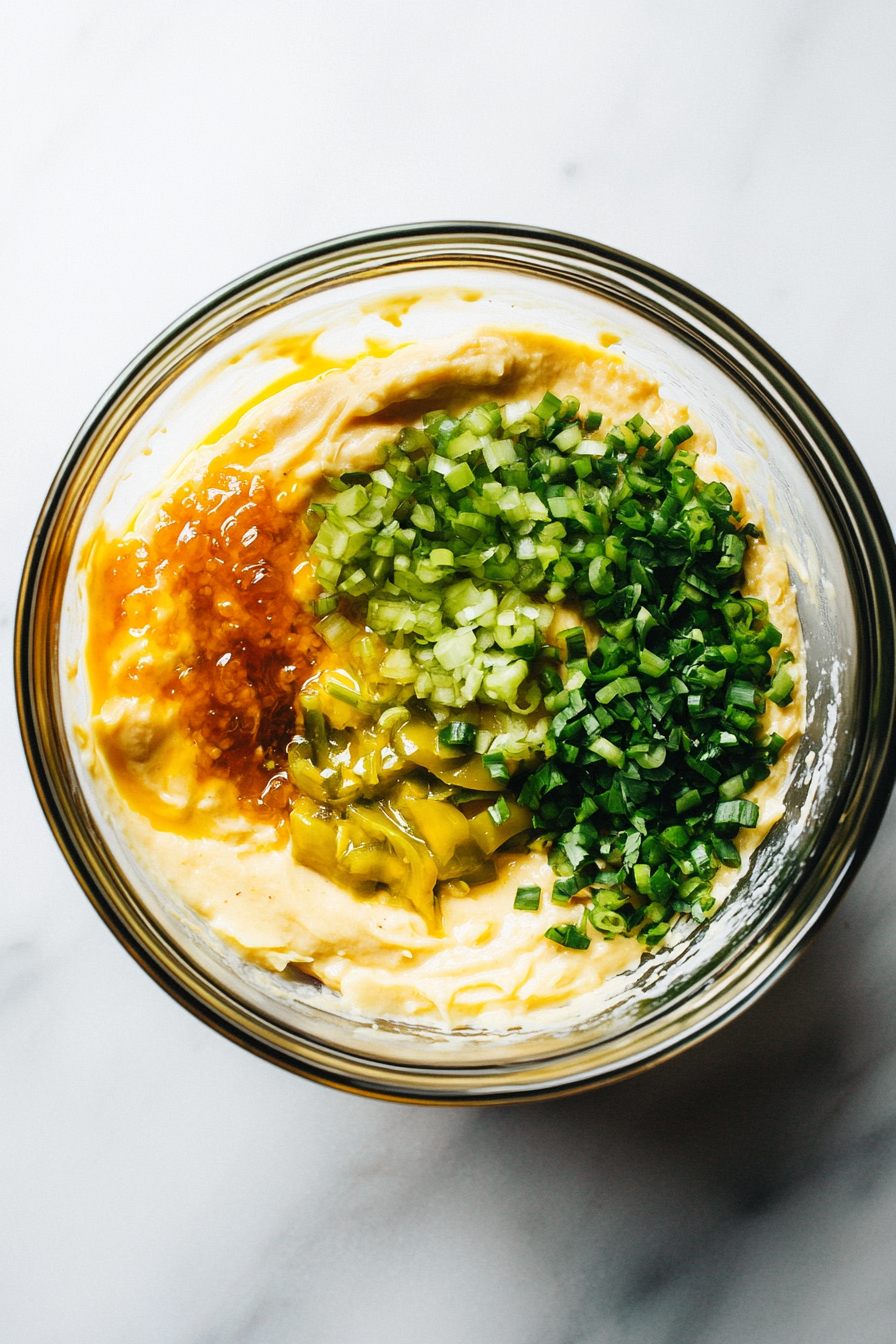 Mix: Add mayonnaise, Creole mustard, green onions, pickled jalapeños, hot sauce, and horseradish to the yolks. Mix until smooth and adjust seasoning. Refrigerate for 15-30 minutes.
