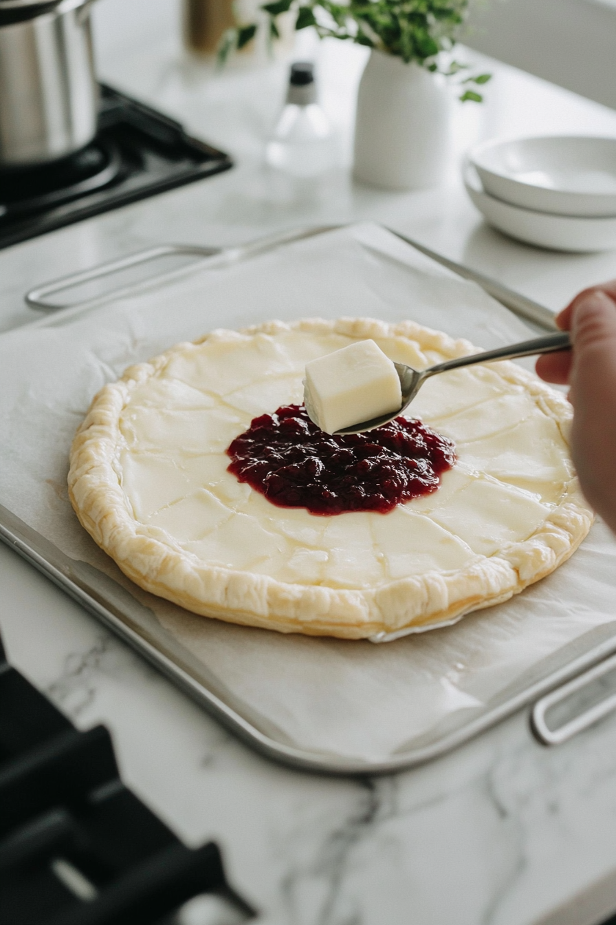 Prepare the Base: Roll out half the puff pastry into a 22cm circle, place on a baking sheet, and spread with 2 tbsp chutney. Top with Camembert and refrigerate.
