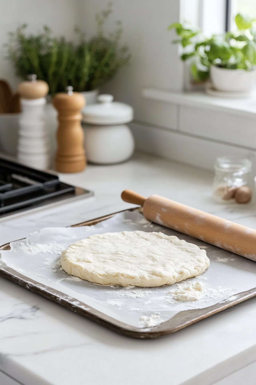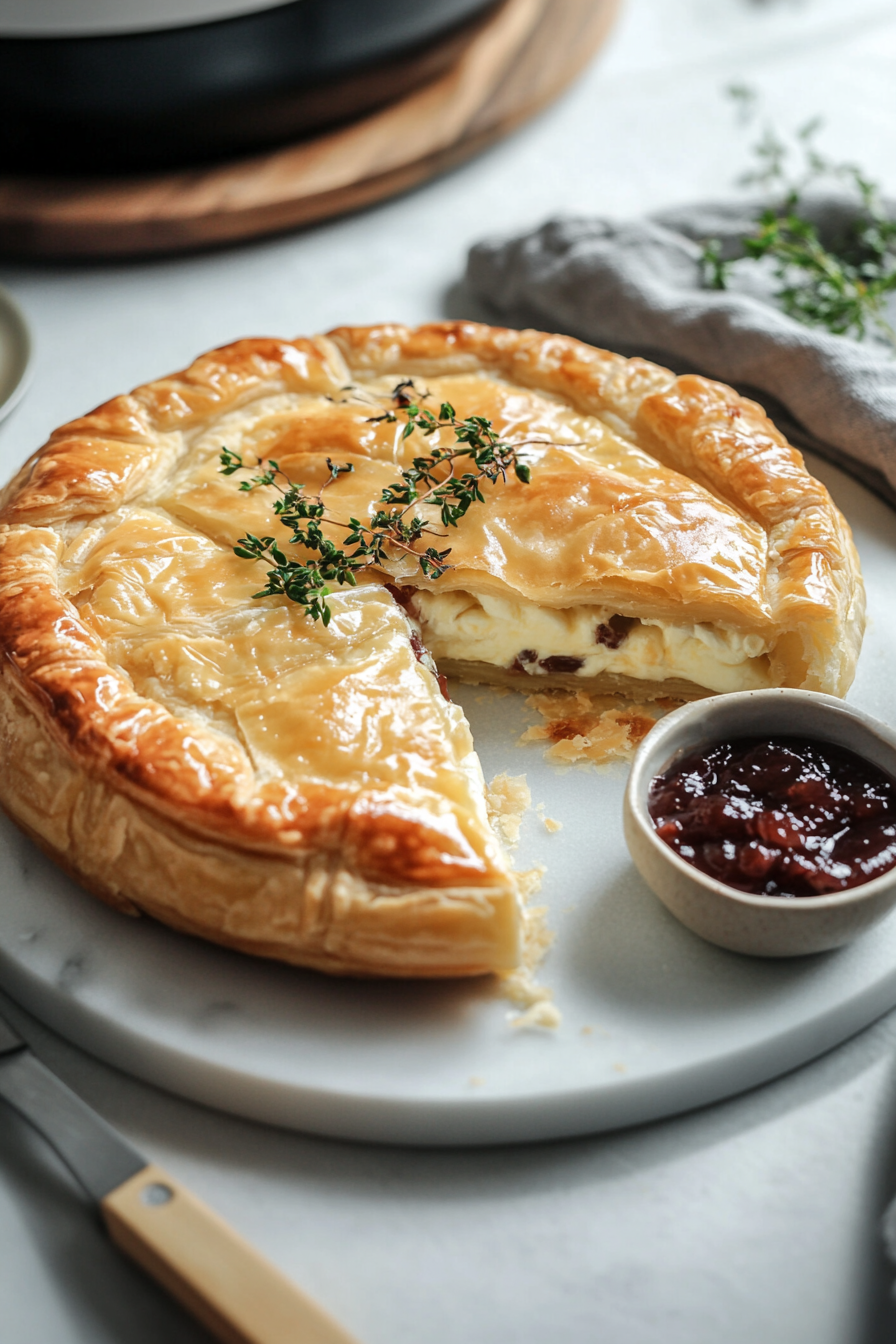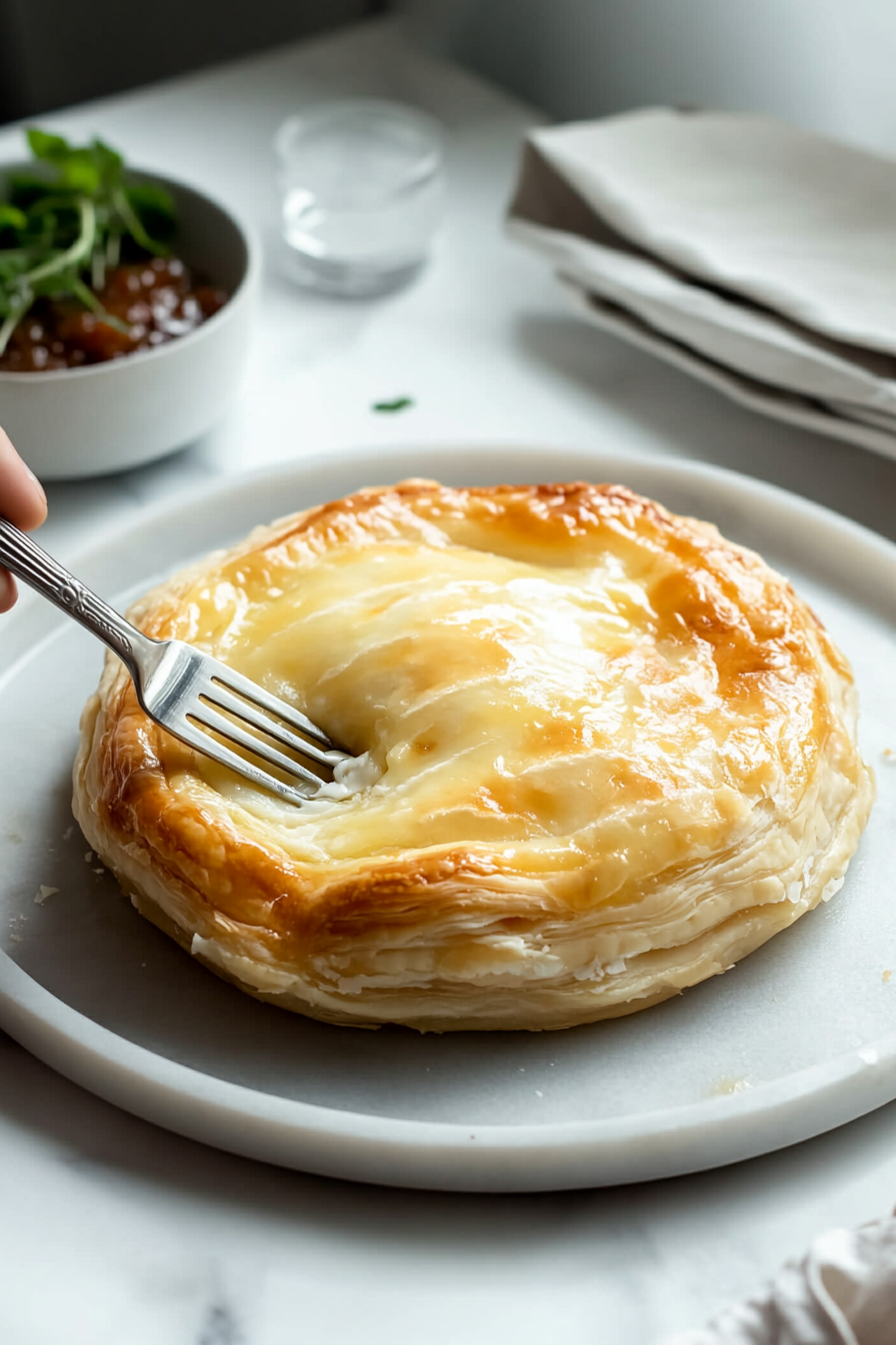 Top Pastry: Roll out the remaining pastry into a circle 5cm larger than the base. Spread 2 tbsp chutney over the cheese, cover with the top pastry, and seal the edges with a fork. Chill for 30 minutes.