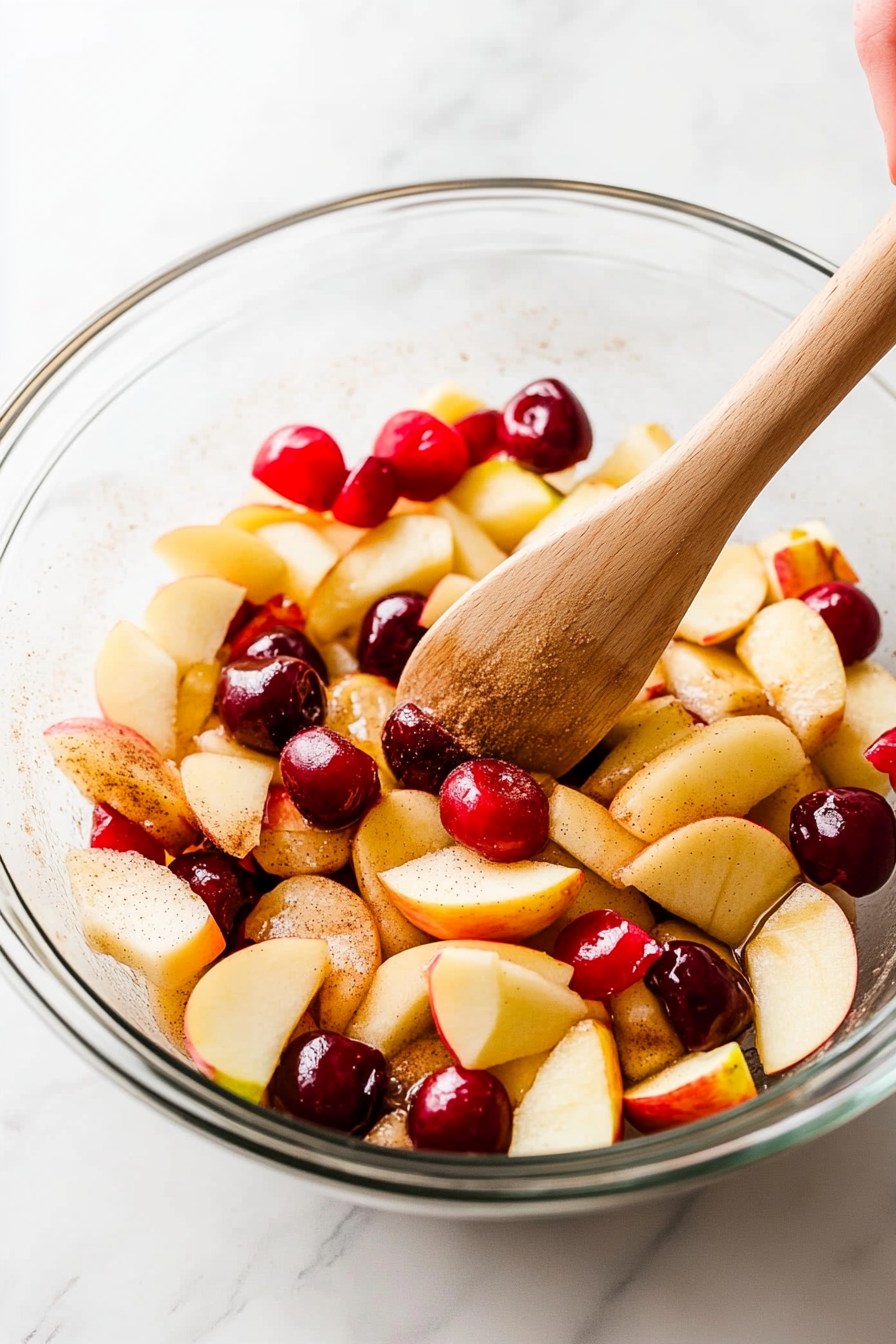 Prepare filling: Toss apples, cherries, brown sugar, cornstarch, cinnamon, and vanilla in a bowl.