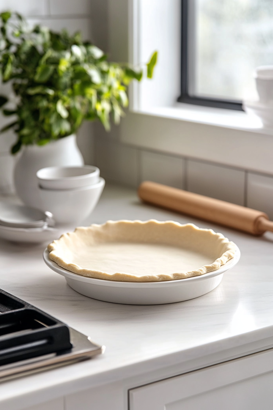 Roll bottom crust: Roll out one dough disc, line a pie dish, and trim the edges.