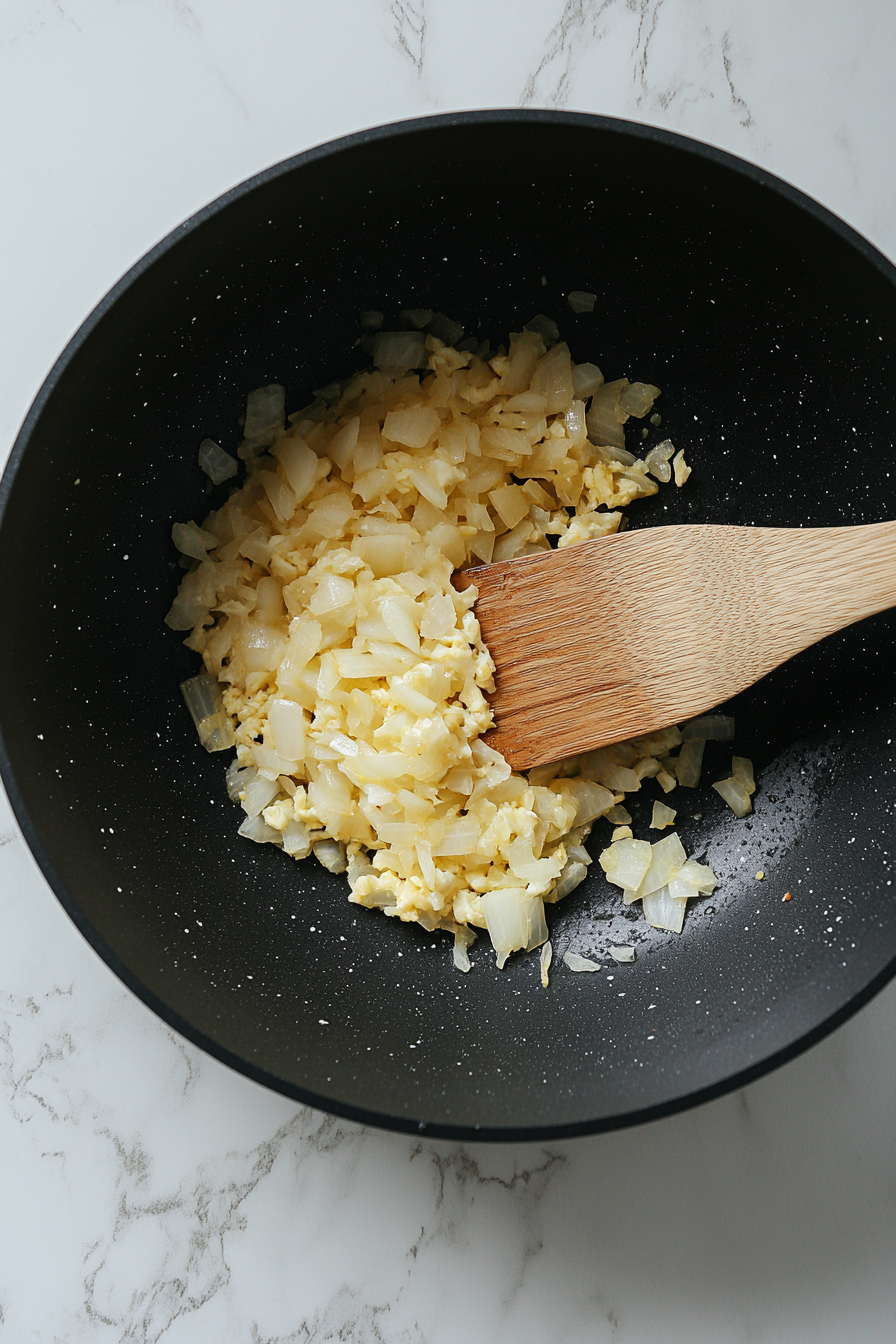 In the same pot, add remaining oil and sauté chopped onions until golden brown.
