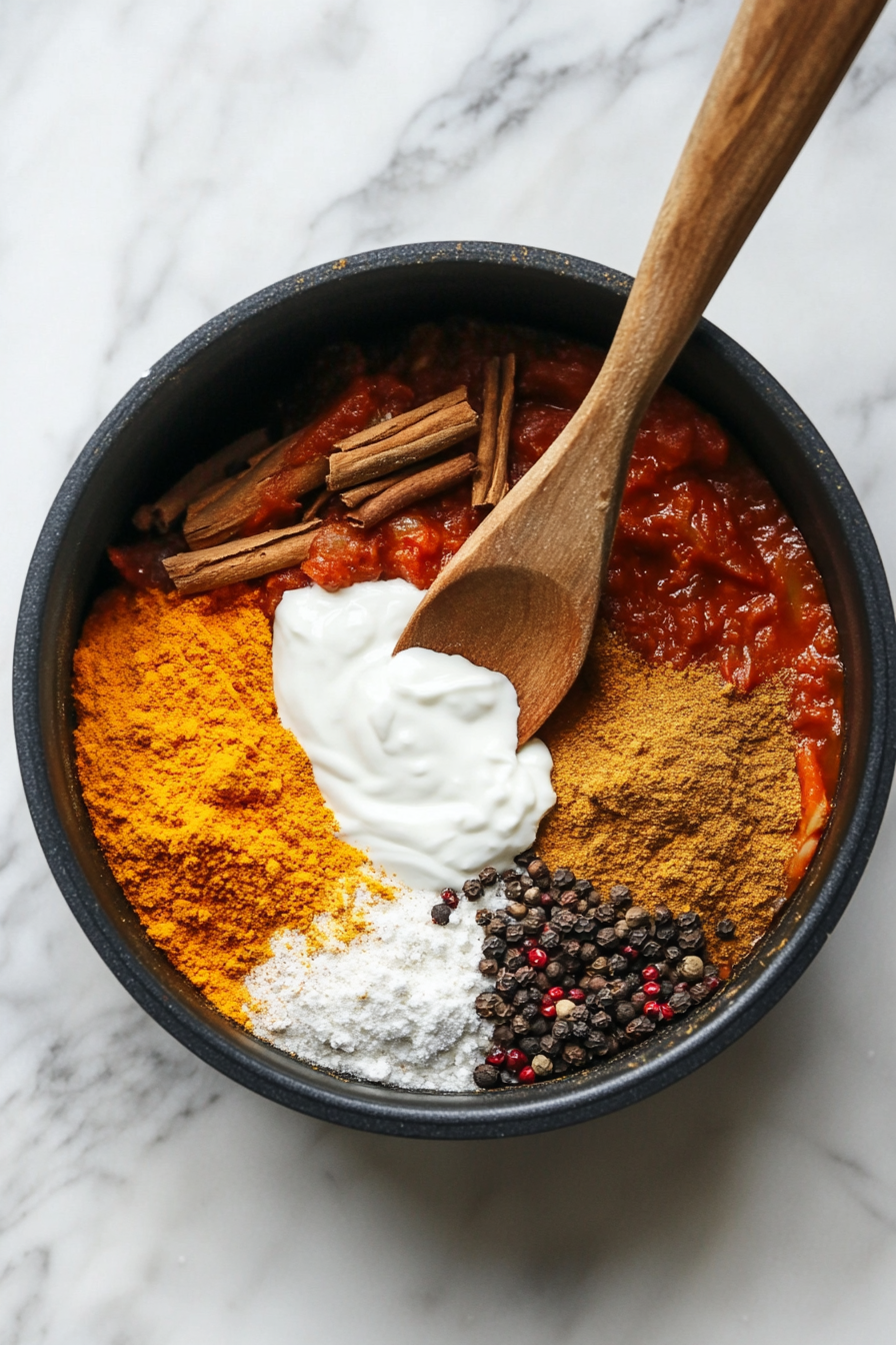 Stir in spices (salt, cumin, chili powder, black pepper, turmeric, cardamom, cinnamon) and yogurt.