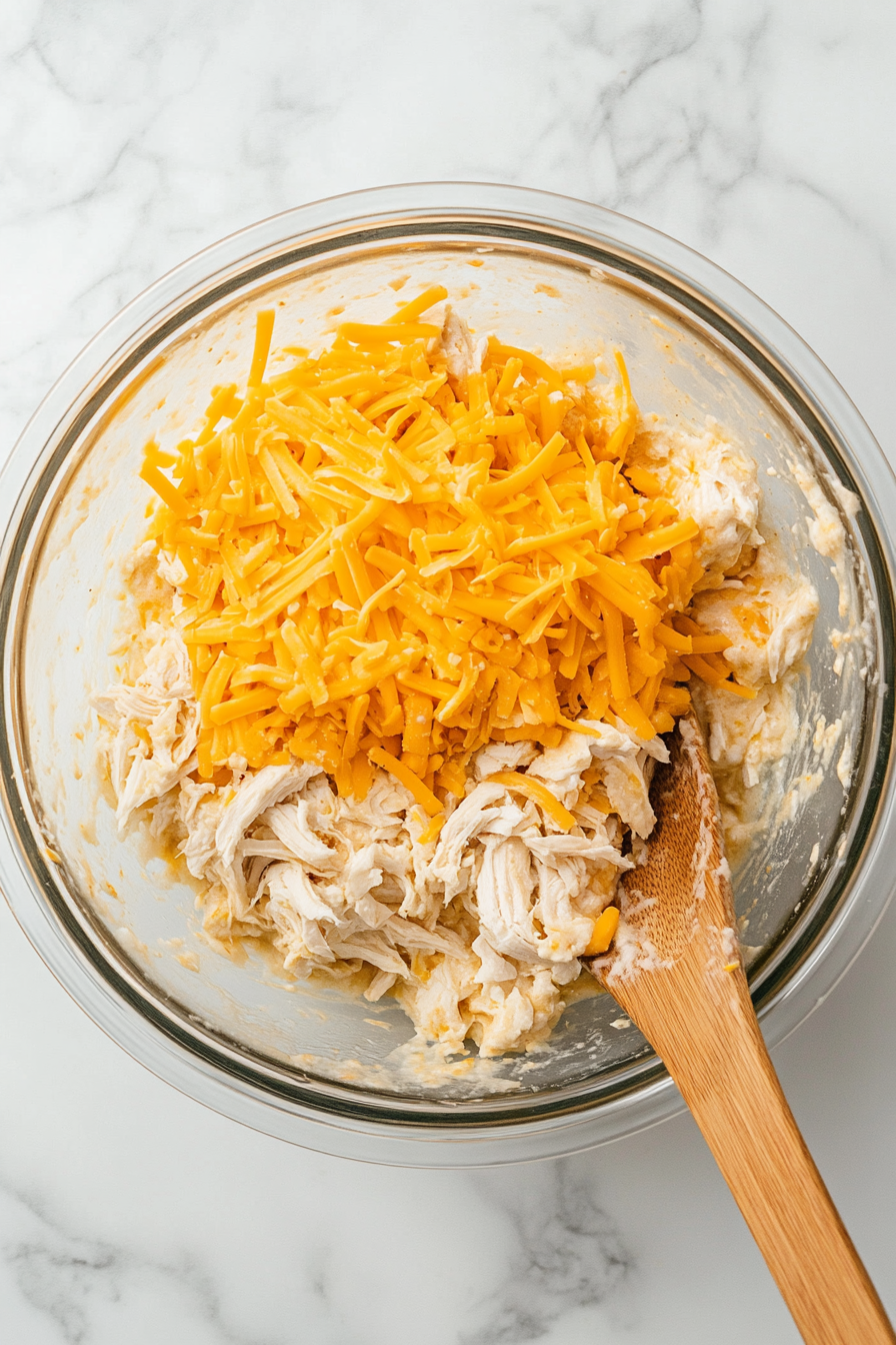 Add in the shredded chicken and 1½ cups of cheddar cheese. Mix well.