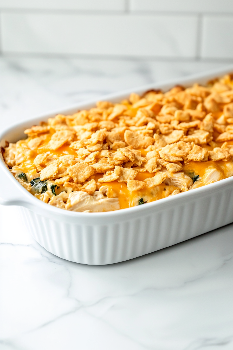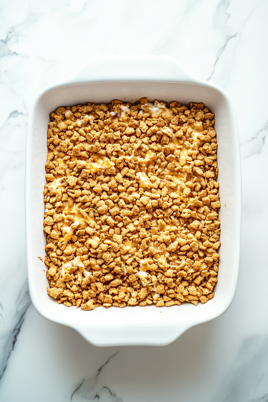 Sprinkle the buttery cracker topping over the chicken mixture.