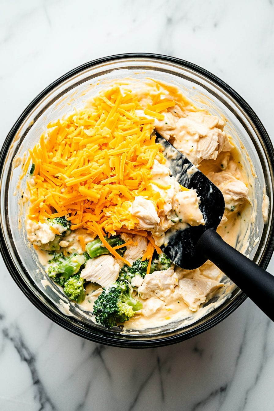 Add chopped chicken, broccoli, and half of the shredded cheddar cheese; stir to combine.
