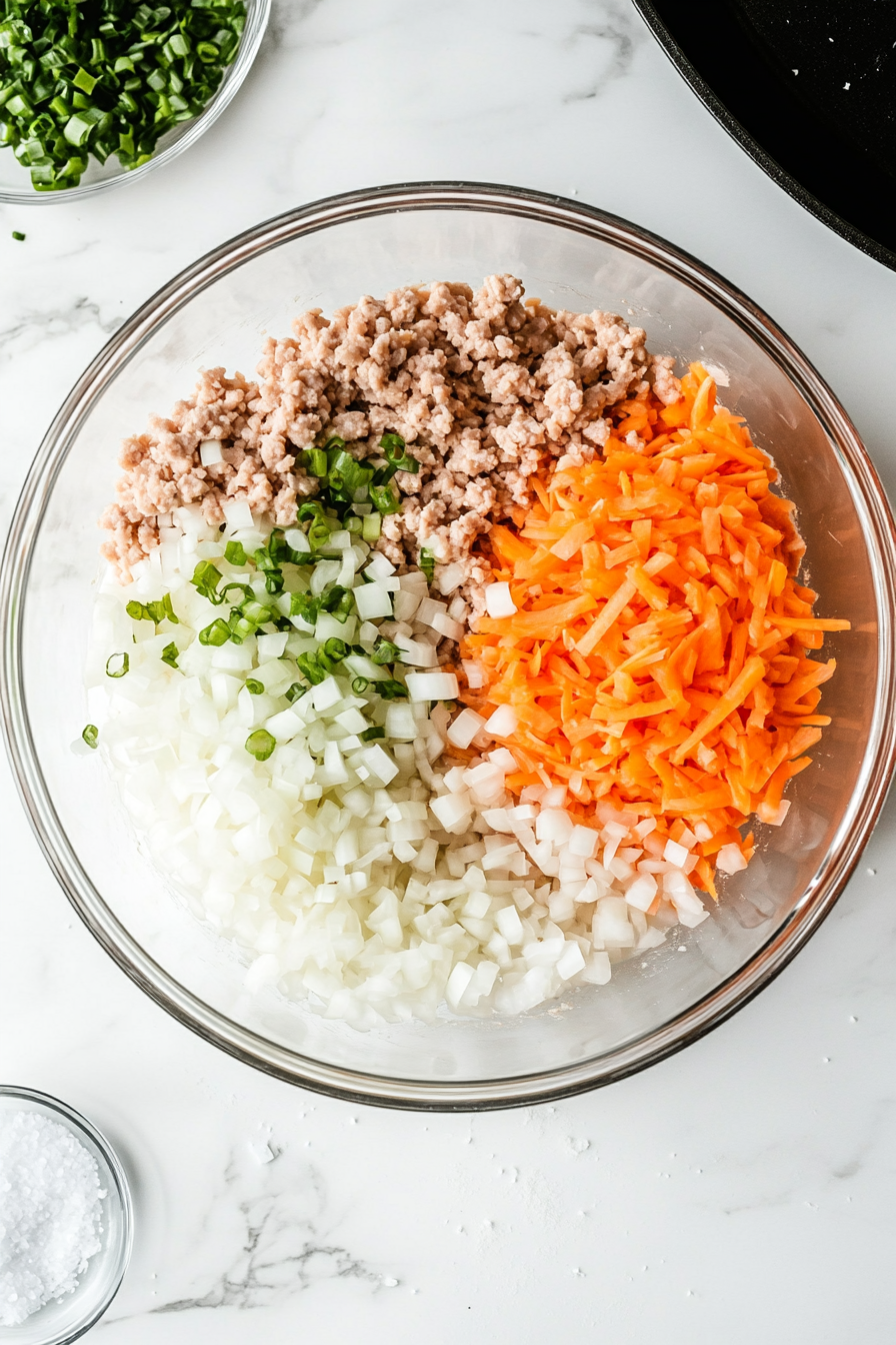 In a bowl, mix ground chicken with cornstarch, soy sauce, salt, onion, and grated carrot.