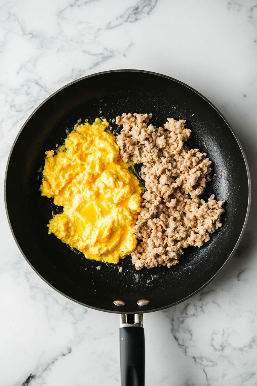 Pour a portion of the egg mixture into the pan and spoon in some of the chicken mixture.