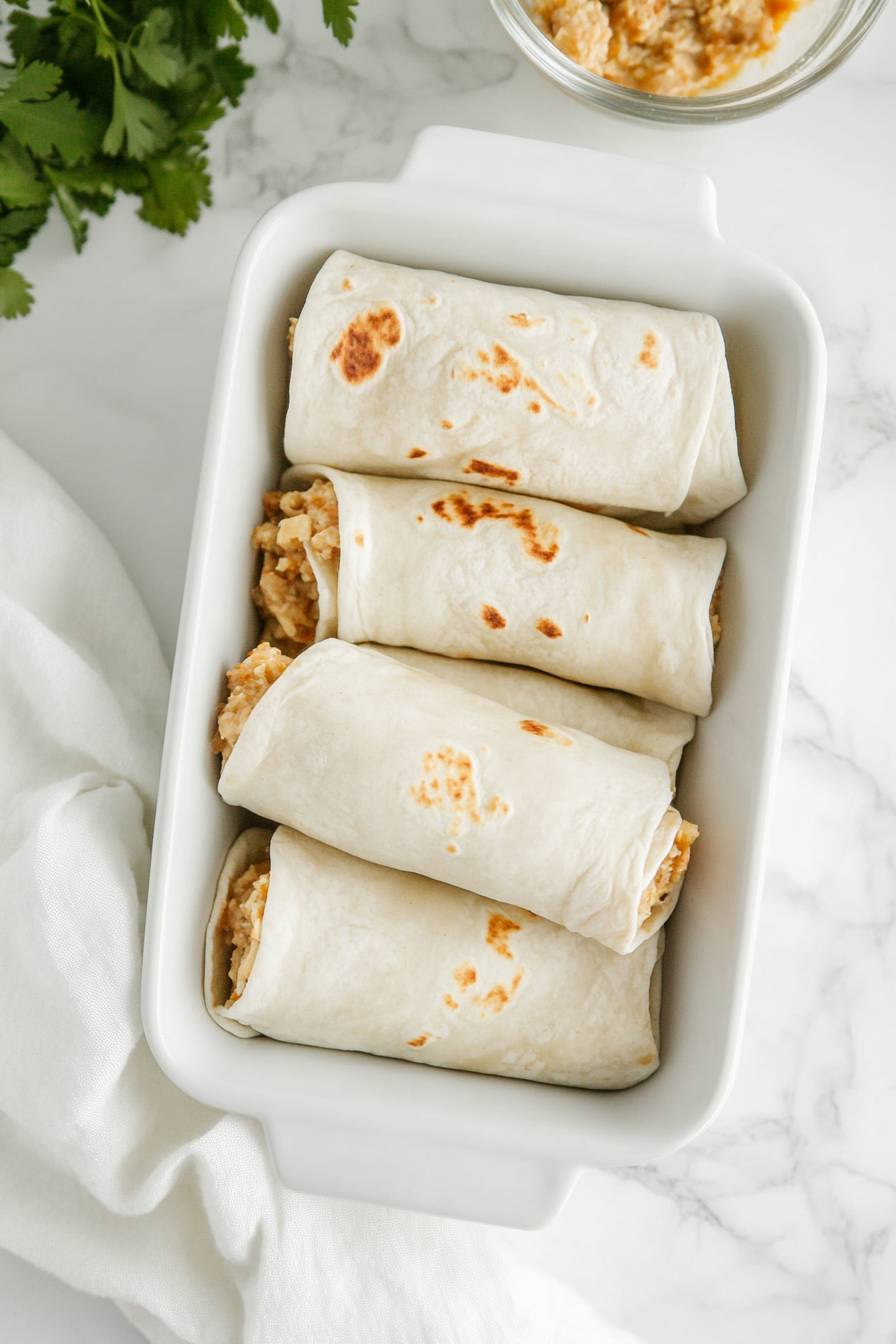 Spread a small amount of the filling onto each flour tortilla, then roll them up tightly.