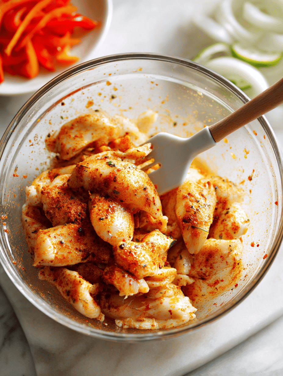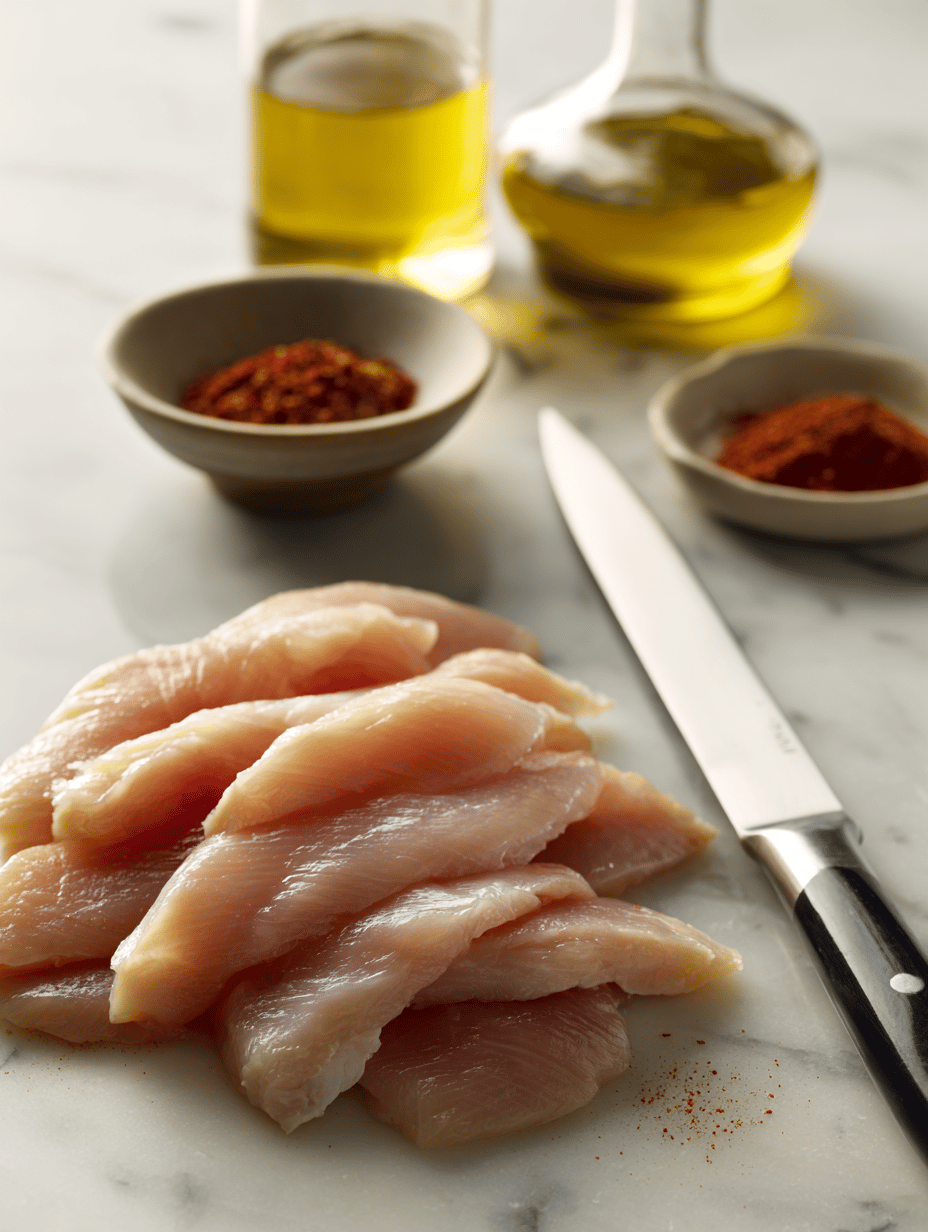 Slice the chicken breast into thin strips, then season with salt, pepper, smoked paprika, and chili powder. Toss to coat evenly.