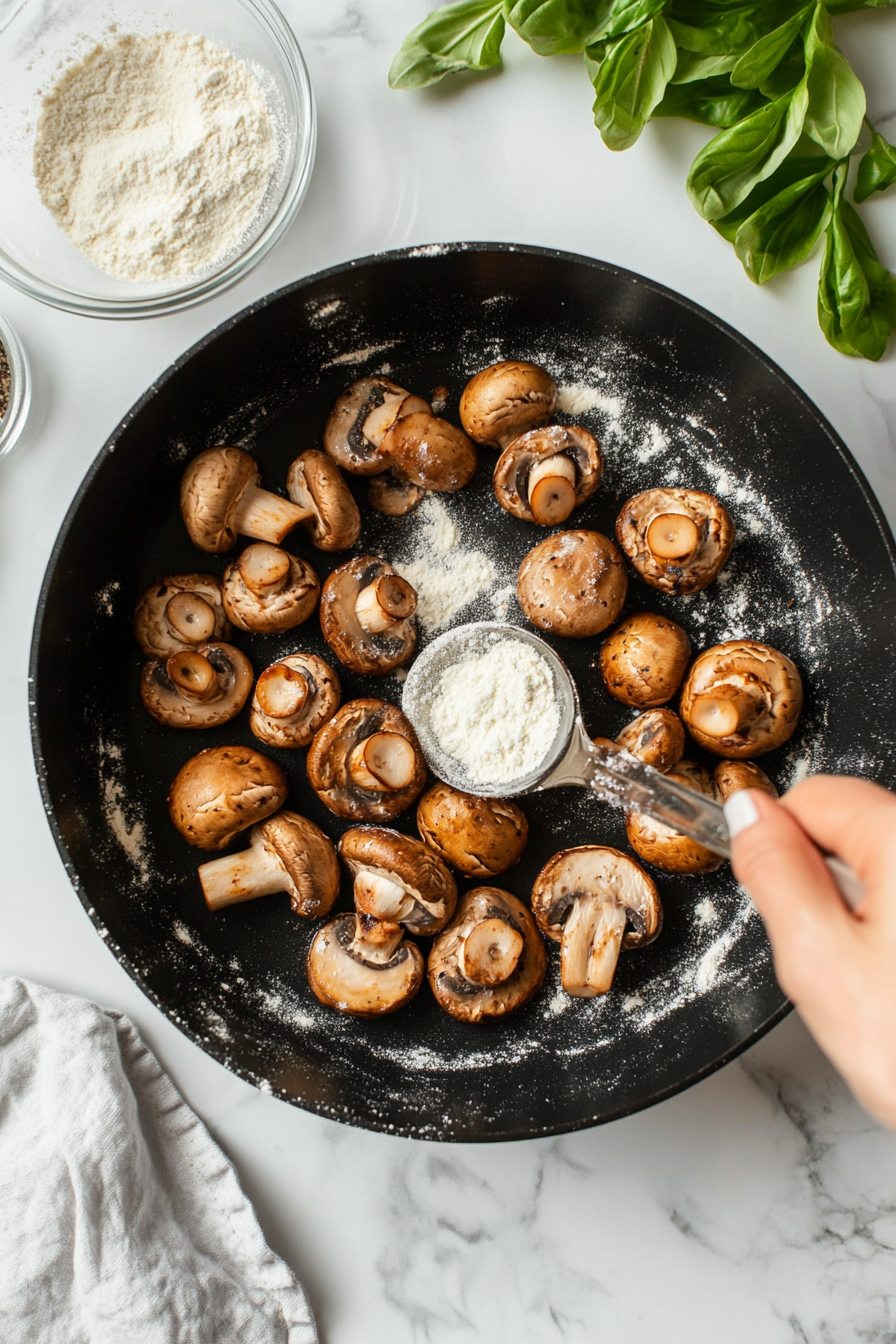 Sprinkle 2 tablespoons flour over mushrooms; cook for 1 minute while stirring.