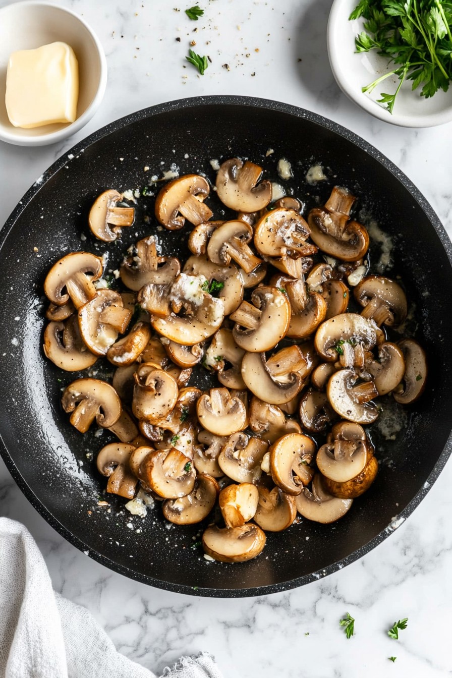 In the same pan, sauté mushrooms and garlic in remaining butter until soft.