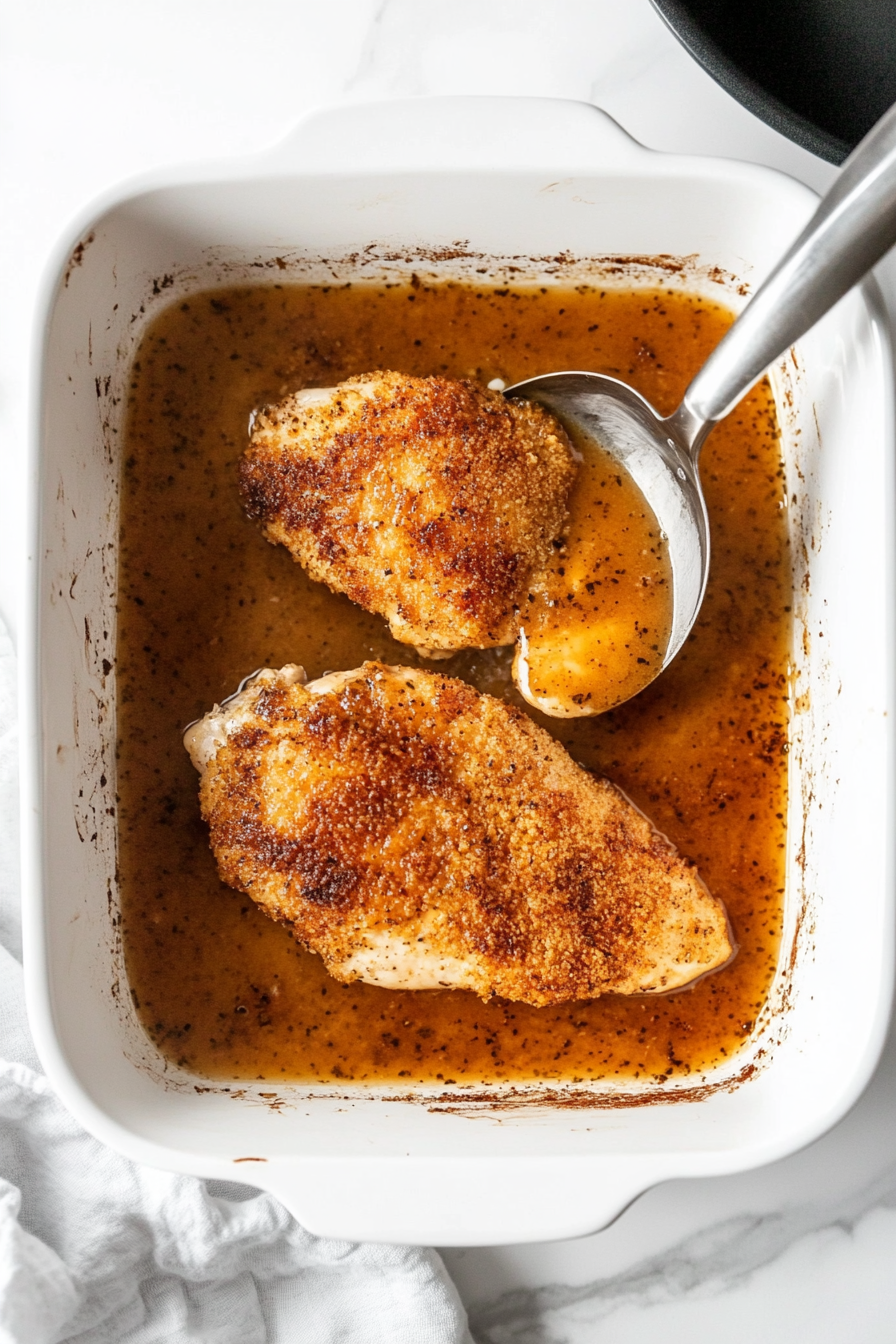 Flatten chicken breasts slightly and coat with melted butter, then dredge in Italian breadcrumbs.