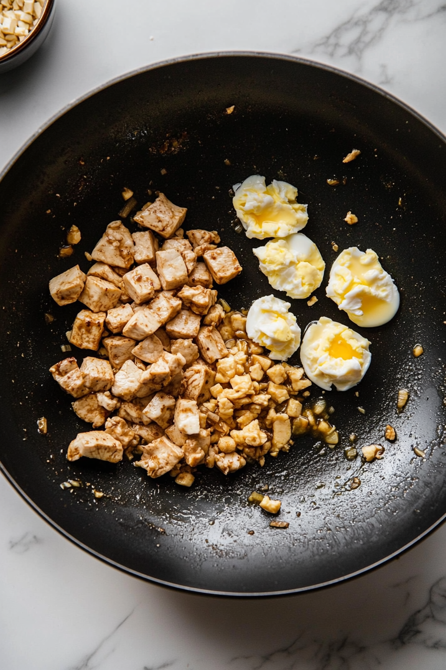 Heat oil in a wok; stir-fry chicken and tofu until golden.