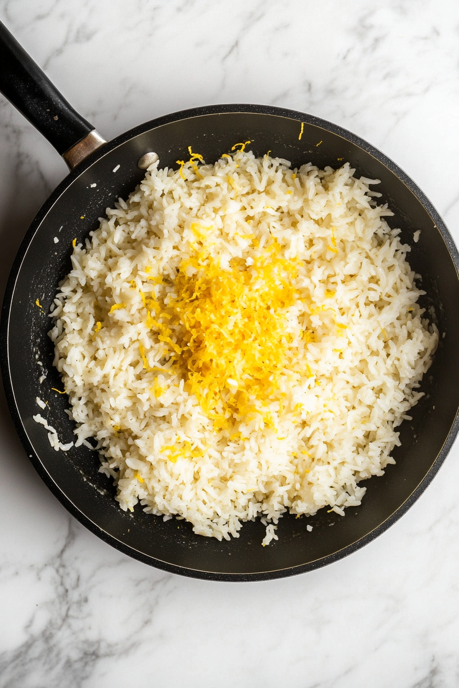 Pour in chicken stock and lemon zest. Let it simmer.