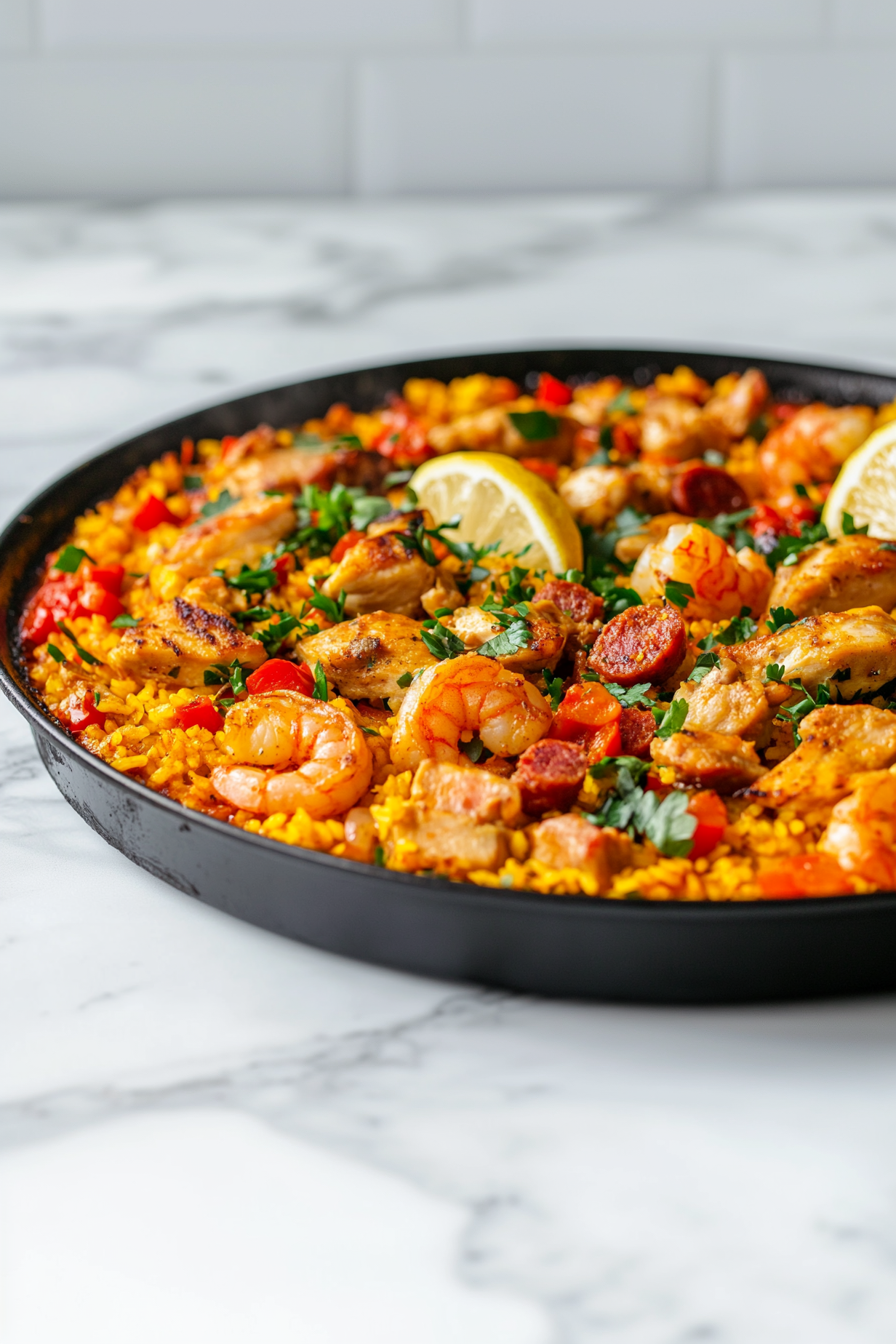 Add marinated chicken and chorizo to the rice mixture. Cook until chicken is browned.