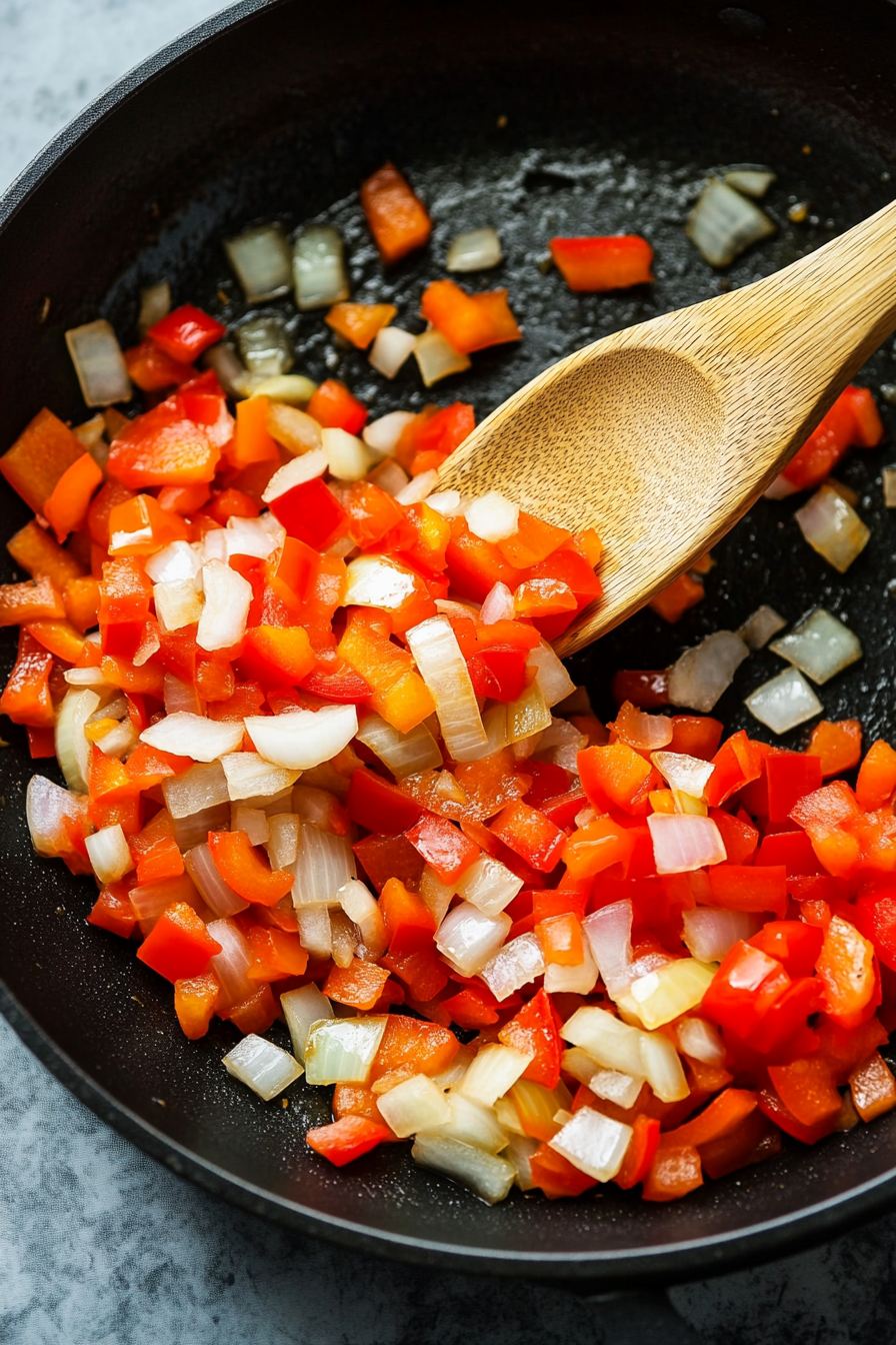 In another pan, sauté onion and bell pepper. Add to the rice.