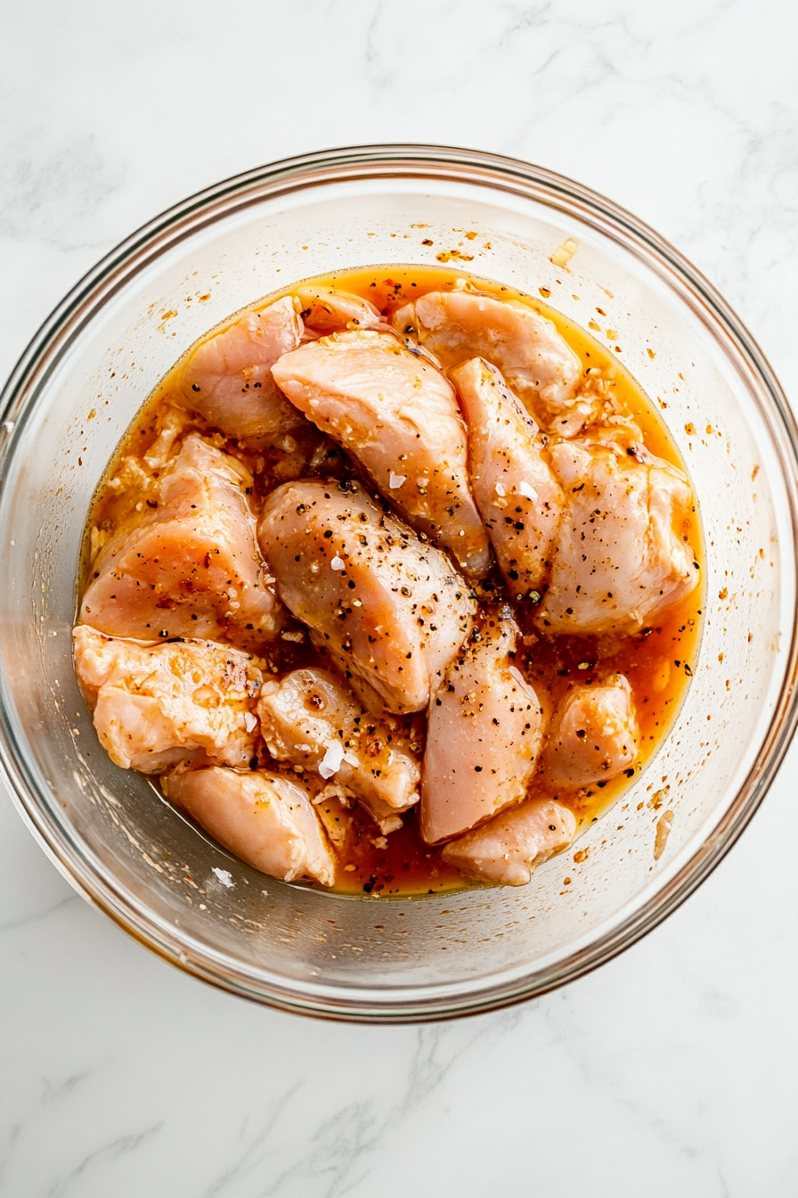 In a bowl, mix chicken with olive oil, paprika, oregano, salt, and pepper. Marinate for 15 minutes.