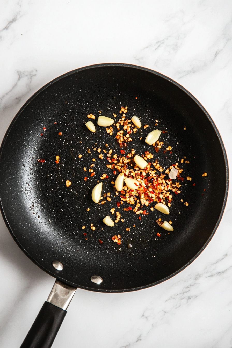 Heat oil in a large pan, sauté garlic and red pepper flakes.