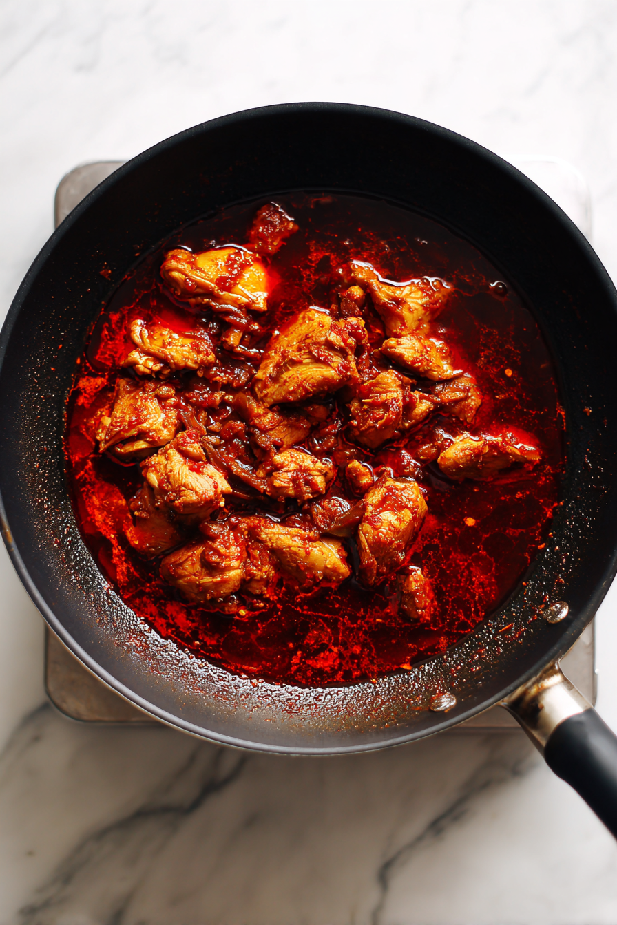 Cook uncovered on low heat, stirring occasionally, until the chicken is tender and the sauce thickens.