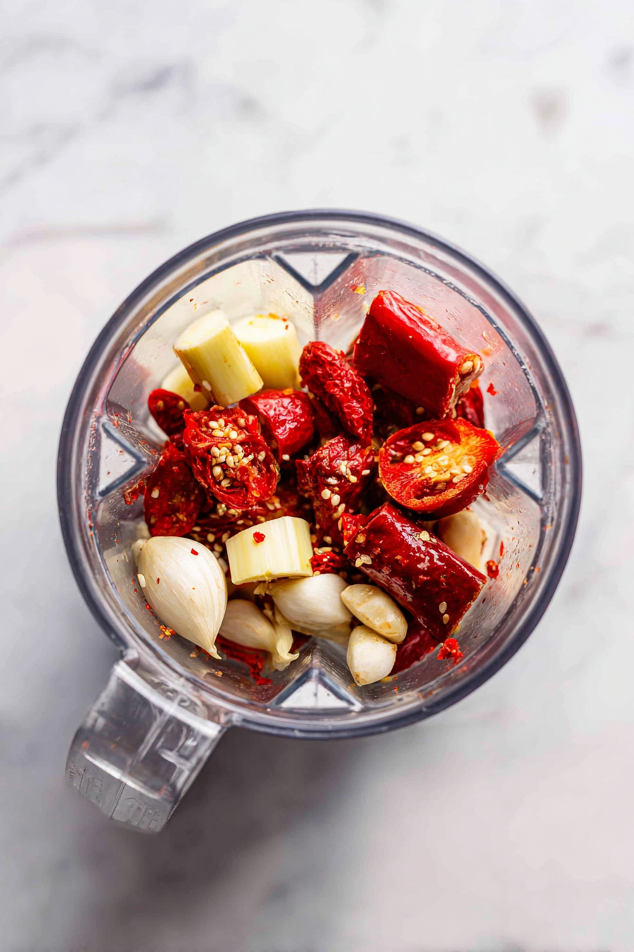 Soak Kashmiri red chillies in hot water for 10 minutes, then blend into a smooth paste with shallots, garlic, ginger, galangal, and lemongrass.