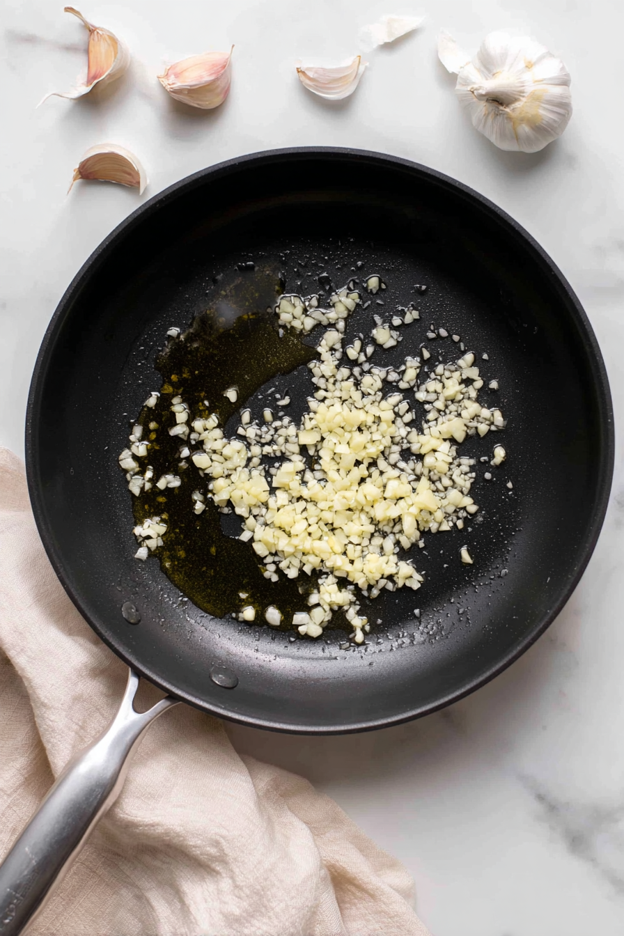 Heat 2 tbsp oil in a skillet, add chopped garlic and sauté until golden.