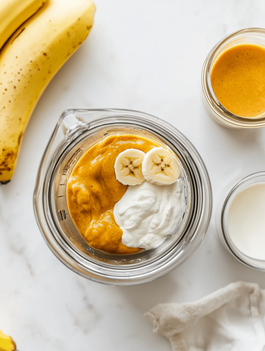 Add the canned pumpkin, ripe banana, Greek yogurt, and chilled almond milk to your blender. Pulled together, these form the creamy base of the smoothie.